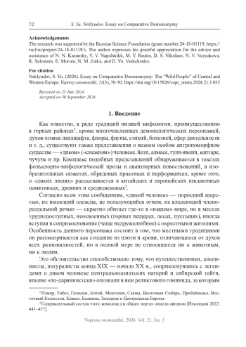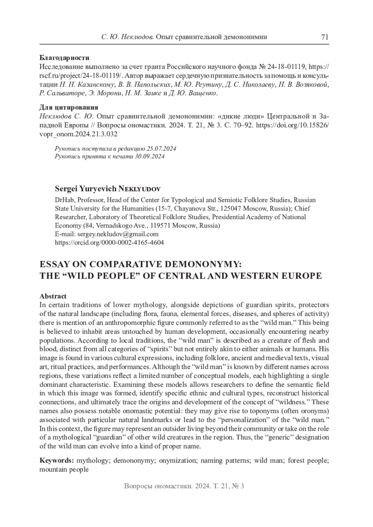 In certain traditions of lower mythology, alongside depictions of guardian spirits, protectors of the natural landscape (including flora, fauna, elemental forces, diseases, and spheres of activity) there is mention of an anthropomorphic figure commonly referred to as the “wild man.” This being is believed to inhabit areas untouched by human development, occasionally encountering nearby populations. According to local traditions, the “wild man” is described as a creature of flesh and blood, distinct from all categories of “spirits” but not entirely akin to either animals or humans. His image is found in various cultural expressions, including folklore, ancient and medieval texts, visual art, ritual practices, and performances. Although the “wild man” is known by different names across regions, these variations reflect a limited number of conceptual models, each highlighting a single dominant characteristic. Examining these models allows researchers to defi ne the semantic field in which this image was formed, identify specific ethnic and cultural types, reconstruct historical connections, and ultimately trace the origins and development of the concept of “wildness.” These names also possess notable onomastic potential: they may give rise to toponyms (often oronyms) associated with particular natural landmarks or lead to the “personalization” of the “wild man.” In this context, the figure may represent an outsider living beyond their community or take on the role of a mythological “guardian” of other wild creatures in the region. Thus, the “generic” designation of the wild man can evolve into a kind of proper name.