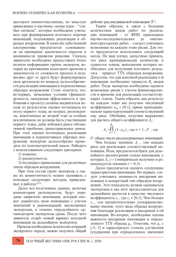 Задача отбора инноваций в интересах их реализации в перспективных образцах вооружения является востребо-ванной для практики и не решается только формализованными методами теории исследования операций1. Поэтому первостепенную важность имеет этап отбора результатов инновационных теоретических исследований и теоретически доказанных идей (далее – инновации), предложенных для постановки фундаментальных поисковых исследований (ФПИ)2. В целом под инновацией следует понимать новшество, обеспечивающее качественный рост эффективности процессов или продукции. Задача состоит в рациональном выборе такого множества инноваций для их дальнейшей реализации, который обеспечит наибольший прирост тактико-технических характеристик (ТТХ) перспективных образцов вооружения. Ряд подходов к оценке, отбору и реализации инноваций для сложных образцов техники описан в статьях3,4.