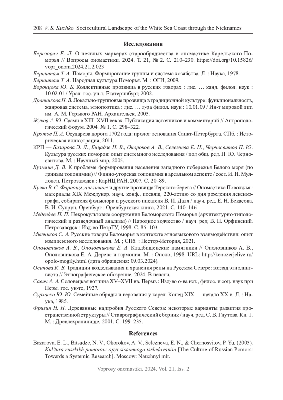 18. Березович Е. Л. О неявных маркерах старообрядчества в ономастике Карельского Поморья // Вопросы ономастики. 2024. Т. 21, № 2. С. 210-230. DOI: 10.15826/vopr_onom.2024.21.2.023 EDN: PLJSFA