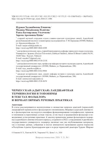 В статье рассматриваются малоизученные в ономастике вопросы адыгской (черкесской) ландшафтной терминологии и фольклорного топонимикона. Впервые в адыгской лингвистике и фольклористике исследуется специфика функционирования географических терминов и топонимов в стереотипных устных текстах, в том числе в традиционном фольклоре и повседневных устно-речевых практиках. К анализу привлечены данные фольклорного подкорпуса адыгейского лингвистического корпуса, созданного в 2022 г. сотрудниками Адыгейского государственного университета: подкорпус включает как уже опубликованные материалы, так и полевые данные, собранные в местах компактного проживания адыгов (черкесов) в Республике Адыгея, Краснодарском крае и в среде черкесской диаспоры Турции. Широко привлечены также материалы фольклорно-этнографических архивов Республики Адыгея и сведения, извлеченные из личных архивов и полевых записей. На этой основе авторами выявляются базовые модели образования и функционирования терминов и топонимов - как в контексте комплексного исследования фольклорного ландшафта, так и в связи с реальными географическими объектами и культурным контекстом. Главное внимание уделено лексемам, которые встречаются на территории исторической Черкесии наиболее часто: пс(ы) ‘вода’, ‘река’, хы ‘море’; къо / къуэ ‘балка’, ‘овраг’, ‘речка’, бгы ‘холм’, ‘гора’, ‘вершина’, ‘хребет’, ‘круча’, ‘обрыв’, къушъхьэ / къущхьэ ‘гора’, тхы ‘возвышенность’, ‘хребет’, ‘гребень горы’, Iуашъхьэ / Iуащхьэ ‘курган’, ‘холм’; хэку ‘область’, ‘родина, отечество’, ‘край’, ‘страна’, ‘государство’. Методом корпусного исследования и дискурс-анализа рассматриваются формы репрезентации как реальных, так и мифических ландшафтных объектов в эпических текстах и речевых практиках. Выявляется продуктивность функционирования топонимов и устанавливается их семантика методом сопоставления сведений из ранних лексикографических источников и новых архивных и полевых материалов. Показано, как в новых языковых условиях (в исследуемом случае - места компактного проживания черкесов диаспоры в Центральной Анатолии) сформировавшаяся неофициальная карта местности функционирует параллельно с административной турецкоязычной. Фиксируемая в фольклорно-речевом дискурсе диаспоры ландшафтная терминология отличается частотностью употребления некоторых единиц в зависимости от наличия / отсутствия тех или иных географических объектов.