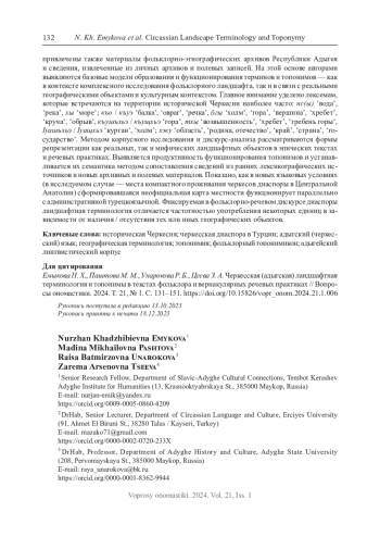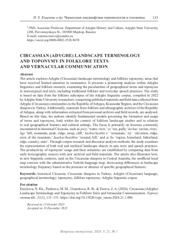 The article explores Adyghe (Circassian) landscape terminology and folklore toponymy, areas that have received limited attention in onomastics. It presents a pioneering analysis within Adyghe linguistics and folklore research, examining the peculiarities of geographical terms and toponyms in stereotypical oral texts, including traditional folklore and everyday speech practices. The study is based on data from the folklore subcorpus of the Adyghe linguistic corpus, compiled in 2022 by Adyghe State University researchers, comprising published materials and field data collected from Adyghe (Circassian) communities in the Republic of Adygea, Krasnodar Region, and the Circassian diaspora in Turkey. Additionally, materials from folklore and ethnographic archives of the Republic of Adygea, along with information extracted from personal archives and field records, are analysed. Based on this data, the authors identify fundamental models governing the formation and usage of terms and toponyms, both within the context of folklore landscape studies and in relation to real geographical features and cultural settings. The focus is primarily on lexemes commonly encountered in historical Circassia, such as ps(y) ‘water, river,’ xy ‘sea, gully,’ ko/kue ‘ravine, river,’ bgy ‘hill, mountain, peak, ridge, steep, cliff,’ kushxe/kushhx`e` ‘mountain,’ txy` ‘elevation, ridge, crest of the mountain,’ Iuashxe/Iuashhxe ‘mound, hill,’ and xe`ku ‘region, homeland, fatherland, edge, country, state’. Through corpus research and discourse analysis methods, the study examines the representation of both real and mythical landscape objects in epic texts and speech practices. The productivity of toponyms’ usage and their semantics are established by comparing data from early lexicographic sources with new archival and field materials. The article also illustrates how, in new linguistic contexts, such as the Circassian diaspora in Central Anatolia, the unoffi cial local map coexists with the administrative Turkish-language map, showcasing differences in landscape terminology frequency based on the presence or absence of specific geographical features.
