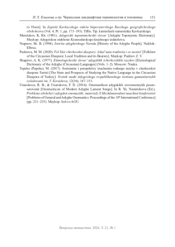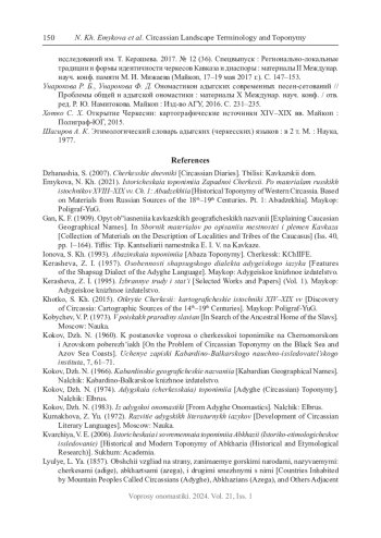 17. Емыкова Н. Х. Историческая топонимия Западной Черкесии. По материалам русских источников XVIII-XIX вв. Ч. 1: Абадзехия. Майкоп: Полиграф-ЮГ, 2021.