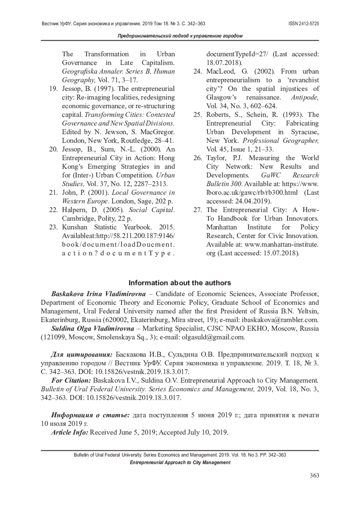 1. Баскакова И.В., Сульдина О.В. Город-предприниматель в российской экономической реальности: проблема идентификации // Вестник УрФУ. Серия экономика и управление. 2017. Том 16, № 4. С. 597-622. EDN: ZIONJZ