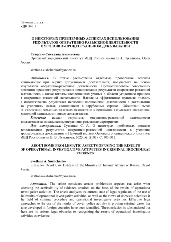 В статье рассмотрены отдельные проблемные аспекты, возникающие при оценке допустимости доказательств, получаемых на основе результатов оперативно-разыскной деятельности. Проанализировано современное состояние правового регулирования использования результатов оперативно-разыскной деятельности, а также взгляды отечественных учёных в области уголовного процесса и оперативно-разыскной деятельности. Выявлены эффективные правовые подходы к использованию результатов негласной полицейской деятельности в доказывании по уголовным делам, сложившиеся в зарубежных странах. Обоснован вывод об отсутствии серьёзных правовых препятствий к признанию результатов оперативно-разыскной деятельности видом доказательств.