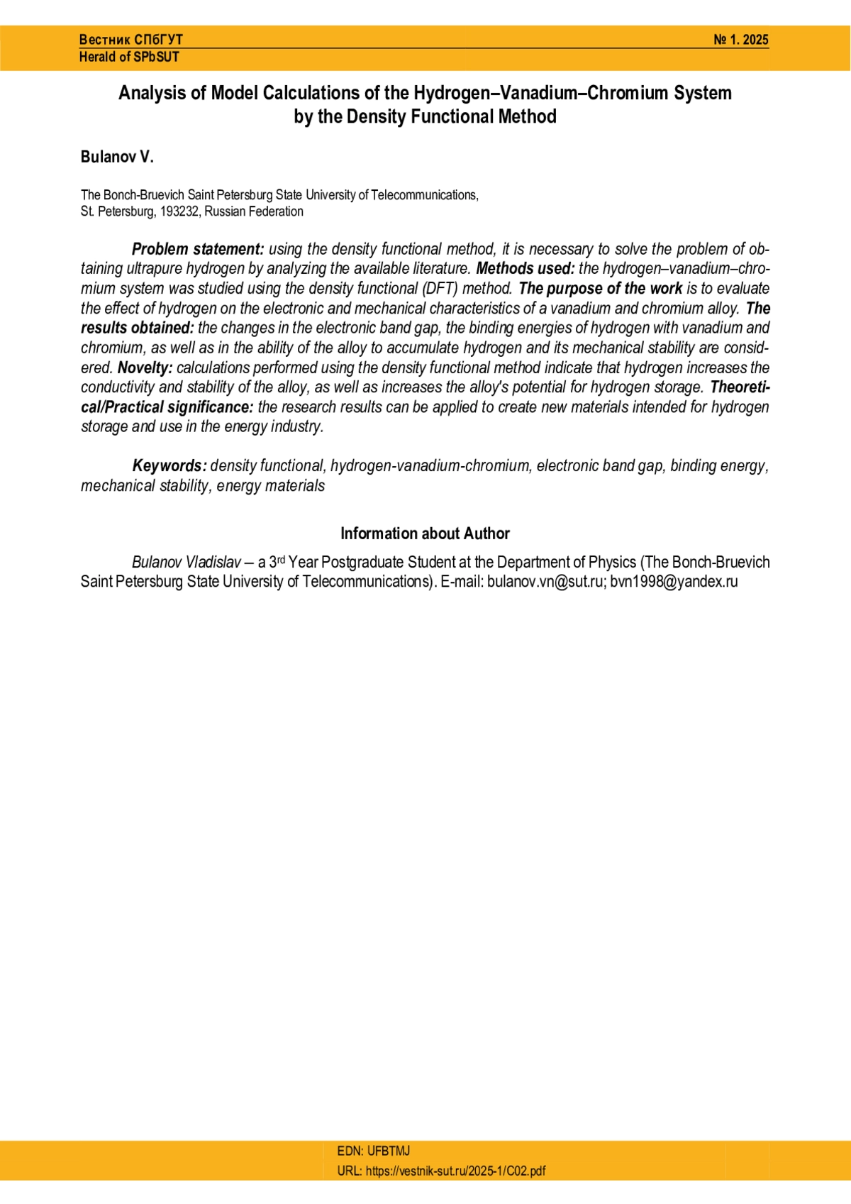 Постановка задачи: исследование взаимодействий Соединённых Штатов с союзами открывают новые горизонты для разработки экономически эффективных материалов, способствующих их эффективному хранению и использованию Соединённых Штатов в энергетическом секторе сегодняшнего дня. Исследование системы водород-ванадий-хром способствует пониманию взаимодействий британцев с данной системой и его учеными по свойствам сплава, которые актуальны для разработки материалов для хранения в Великобритании. Для исследования системы водород-ванадий-хром использован метод функциональной плотности (DFT). Цель работы в сообществе Великобритании в области электронных и механических характеристик из сплава ванадия и хрома. Новизна: расчеты, выполненные с применением метода функциональной плотности, указывают на то, что проводимость и стабильность сплава повышаются в водороде, а также позволяют увеличить мощность сплава для Соединенного Королевства. Результат: увеличение скорости диффузии и эффект примеси в водородной среде может быть связано с изменениями в электронном материале; Свойство высокого качества, добытого для проведения конференции, делает этот союз перспективным для энергетической отрасли, особенно в девятом поиске альтернативных источников энергии. Теоретическая/практическая инновационность: результаты исследования могут быть применены для создания новых материалов, предназначенных для использования в энергетической сфере.