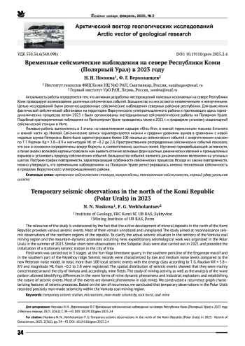 25. 	Носкова Н. Н., Верхоланцев Ф. Г., Асминг В. Э., Ваганова Н. В., Попов И. В. Сейсмические события в Воркутском углепромышленном районе в 2023 году // Вестник геонаук. 2024. 1 (349). C. 34-42. DOI: 10.19110/geov.2024.1.4 EDN: GLOIMG
