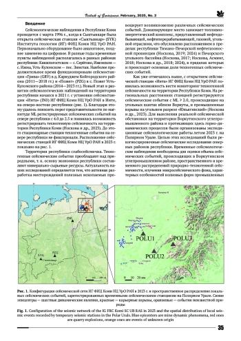 Актуальность работы определяется тем, что активная разработка месторождений полезных ископаемых на севере Республики Коми провоцирует возникновение различных сейсмических событий. Большинство из них остаются незамеченными и неизученными. Целью исследований были рекогносцировочные сейсмические наблюдения северных районов республики. Для выяснения фактической сейсмической обстановки на территории Воркутинского углепромышленного района и протекающих здесь горно-динамических процессов летом 2023 г. были организованы экспедиционные сейсмологические работы на Полярном Урале. Подобные кратковременные наблюдения на Приполярном Урале проводились также в 2021 г. и предваряли установку стационарной сейсмической станции в Инте. Полевые работы выполнялись в 3 этапа: на известняковом карьере «Юнь-Яга», в южной периклинали массива Енганепэ и южной части хр. Нияхой. Сейсмические записи характеризуются низким и средним уровнями шумов в сравнении с новой моделью шумов Петерсона. Всего было зарегистрировано более 100 локальных сейсмических событий с энергетическим классом по Т. Г. Раутиан Кр = 3.8-8.9 и магнитудой ML от -0.2 до 2.8. Пространственное распределение сейсмических событий показало, что они в основном сосредоточены вокруг Воркуты и, соответственно, шахтных полей. Изучение горнодобывающей активности, а также анализ волновой картины позволили нам выявить отличия волновых форм шахтных динамических явлений и промышленных взрывов и установить природу сейсмических событий. Большинство событий являются динамическими явлениями на угольных шахтах. Построен график повторяемости, характеризующий особенности сейсмических процессов. Исходя из закона повторяемости, можно утверждать, что временными наблюдениями на Полярном Урале регистрировалась именно техногенная сейсмичность в пределах Воркутинского углепромышленного района.