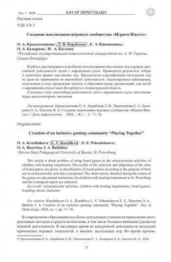 В работе рассматривается проблема использования настольных игр в рамках внеучебной деятельности детей с нарушением слуха. Приводятся результаты отбора и адаптации правил настольных игр. Предлагается классификация настольных игр по цели их применения во внеучебной деятельности. Анализируются наблюдения, полученные в ходе проведения игротек в образовательных организациях для детей с нарушением слуха Санкт-Петербурга и Ленинградской области.