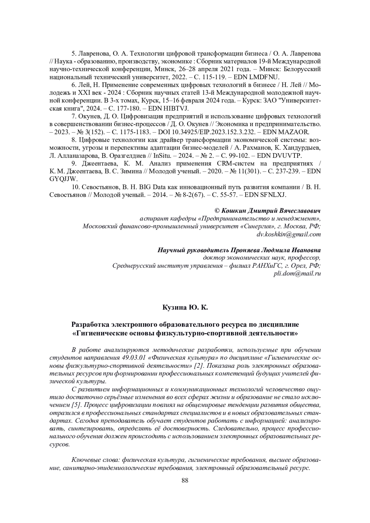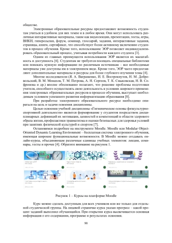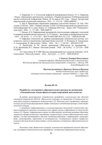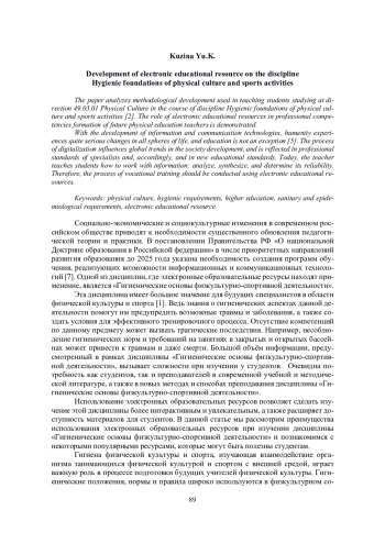 В работе анализируются методические разработки, используемые при обучении студентов направления 49.03.01 «Физическая культура» по дисциплине «Гигиенические основы физкультурно-спортивной деятельности» [2]. Показана роль электронных образовательных ресурсов при формировании профессиональных компетенций будущих учителей физической культуры. С развитием информационных и коммуникационных технологий человечество ощутило достаточно серьёзные изменения во всех сферах жизни и образование не стало исключением [5]. Процесс цифровизации повлиял на общемировые тенденции развития общества, отразился в профессиональных стандартах специалистов и в новых образовательных стандартах. Сегодня преподаватель обучает студентов работать с информацией: анализировать, синтезировать, определять её достоверность. Следовательно, процесс профессионального обучения должен происходить с использованием электронных образовательных ресурсов.