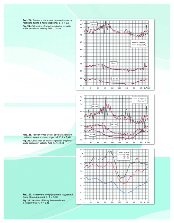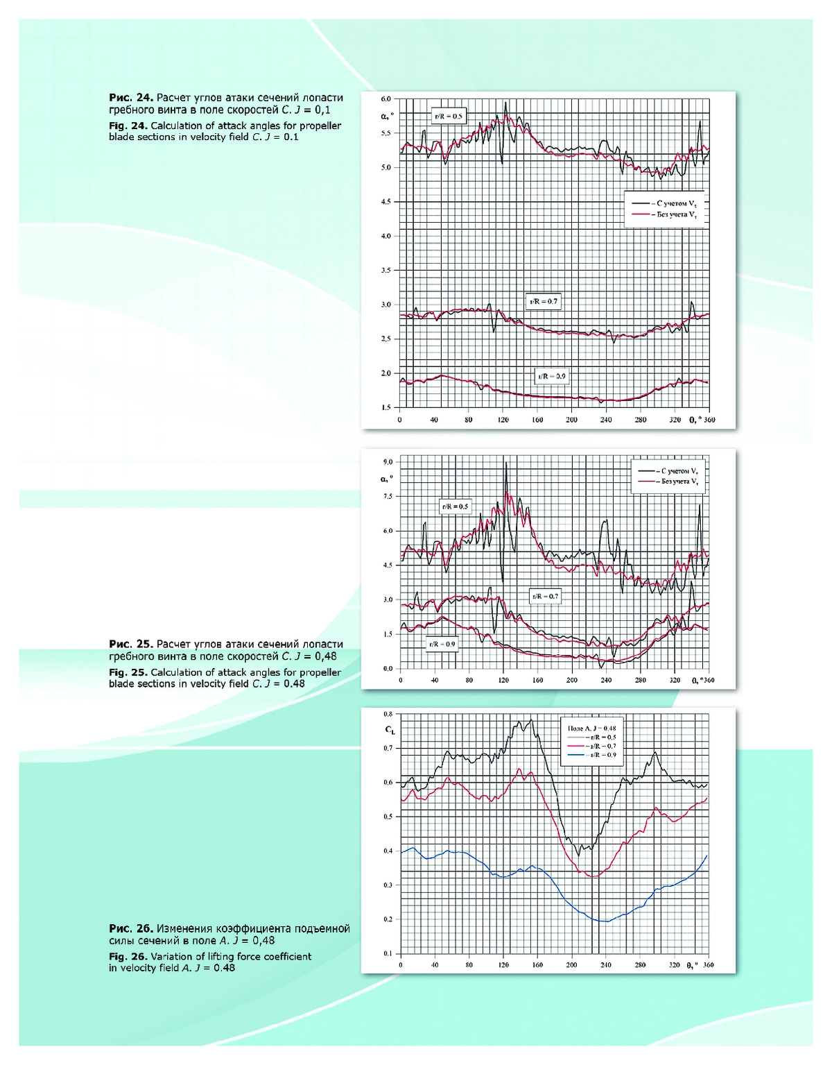 Заключение. Проведенный в первой части анализ условий работы лопастей в неоднородном поле скоростей проводился с акцентом на пропульсивные качества ГВ. Использованы как приближенные экспериментальные, так и современные расчетные методы для оценки углов атаки сечений лопастей. Показано, что диапазон изменения углов атаки для некоторых типов полей скоростей превышает ширину пологого максимума зависимости качества профилей от углов атаки, что обуславливает снижение КПД гребного винта.