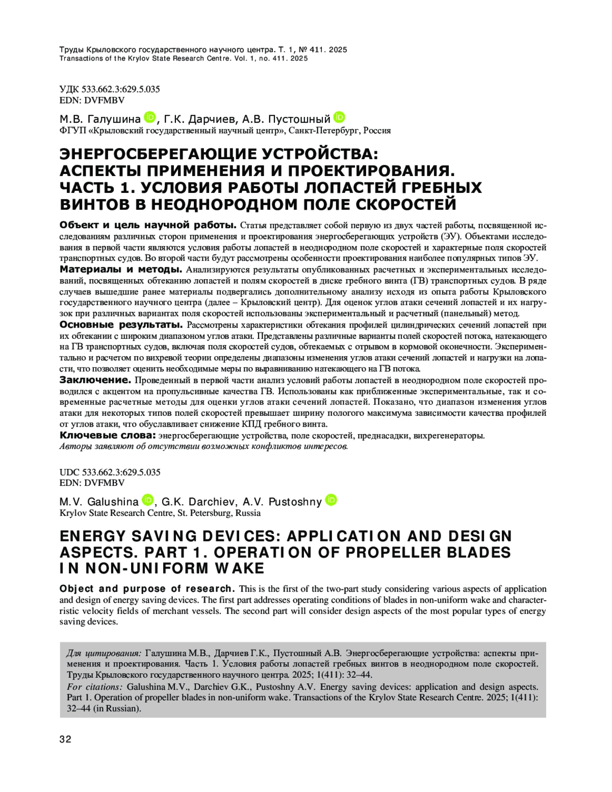 12. Галушина М.В., Пустошный А.В., Сверчков А.В. Особенности проектирования кормовой оконечности одновальных судов с предотрывным и отрывным обтеканием // Труды Крыловского государственного научного центра. 2024. Вып. 1(407). С. 25–43.