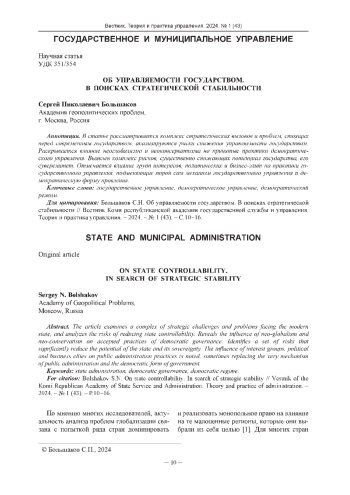 БОЛЬШАКОВ С. Н. ОБ УПРАВЛЯЕМОСТИ ГОСУДАРСТВОМ. В ПОИСКАХ СТРАТЕГИЧЕСКОЙ СТАБИЛЬНОСТИ // ВЕСТНИК КОМИ РЕСПУБЛИКАНСКОЙ АКАДЕМИИ ГОСУДАРСТВЕННОЙ СЛУЖБЫ И УПРАВЛЕНИЯ. ТЕОРИЯ И ПРАКТИКА УПРАВЛЕНИЯ. 2024. № 1 (43)
