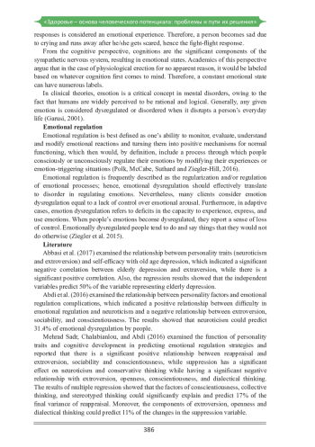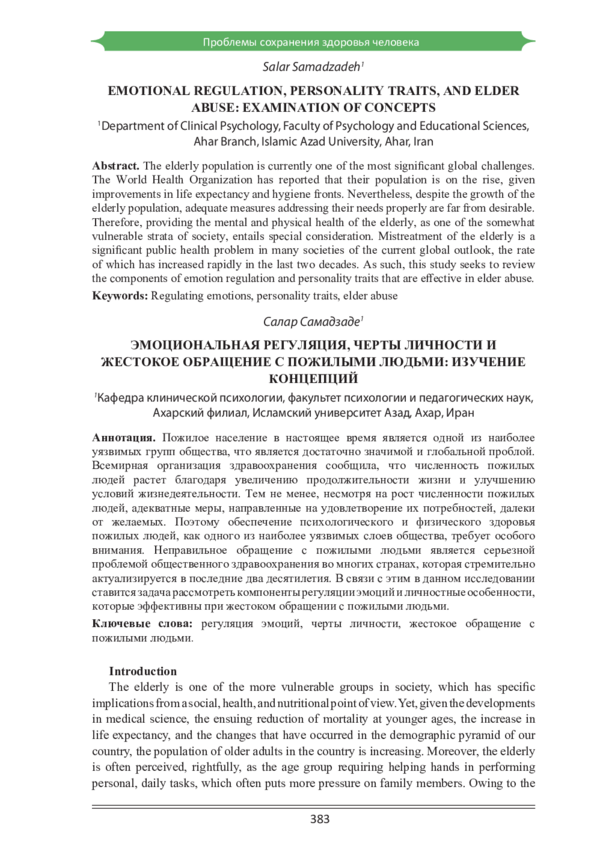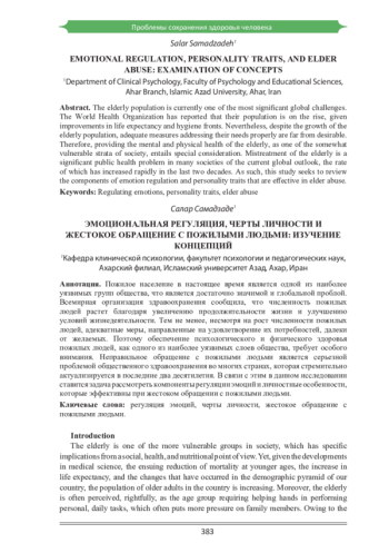 Пожилое население в настоящее время является одной из наиболее уязвимых групп общества, что является достаточно значимой и глобальной проблой. Всемирная организация здравоохранения сообщила, что численность пожилых людей растет благодаря увеличению продолжительности жизни и улучшению условий жизнедеятельности. Тем не менее, несмотря на рост численности пожилых людей, адекватные меры, направленные на удовлетворение их потребностей, далеки от желаемых. Поэтому обеспечение психологического и физического здоровья пожилых людей, как одного из наиболее уязвимых слоев общества, требует особого внимания. Неправильное обращение с пожилыми людьми является серьезной проблемой общественного здравоохранения во многих странах, которая стремительно актуализируется в последние два десятилетия. В связи с этим в данном исследовании ставится задача рассмотреть компоненты регуляции эмоций и личностные особенности, которые эффективны при жестоком обращении с пожилыми людьми.