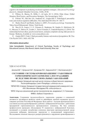 Сохранение трудоспособности, укрепление здоровья и социальной активности трудящихся является одной из важнейших проблем медицины труда в северных регионах Российской Федерации. Цель работы - изучение функционального состояния системы кровообращения у рабочих с вибрационной болезнью - работников предприятий горнохимического промышленного комплекса. На базе клиники профпатологии проведено обследование 91 пациентов с вибрационной болезнью, возникшей в условиях воздействия комплекса факторов производственной среды (локальная вибрация, физические перегрузки и охлаждающий микроклимат). Исследования показали высокую распространенность нарушения кровообращения вкистях и предплечьях в обеих стажевых и возрастных группах больных. Своевременное определение характера и частоты распространения центральных и периферических доклинических нарушений может оказаться полезным для разработки вопросов медицинской тактики по предупреждению и своевременной целенаправленной терапии профессиональной и сердечно-сосудистой патологии у работников, осуществляющих трудовую деятельность на предприятиях Арктической зоны Российской Федерации.