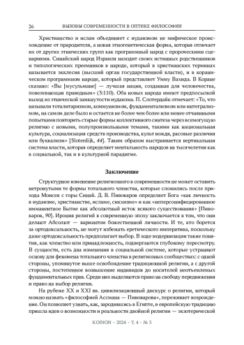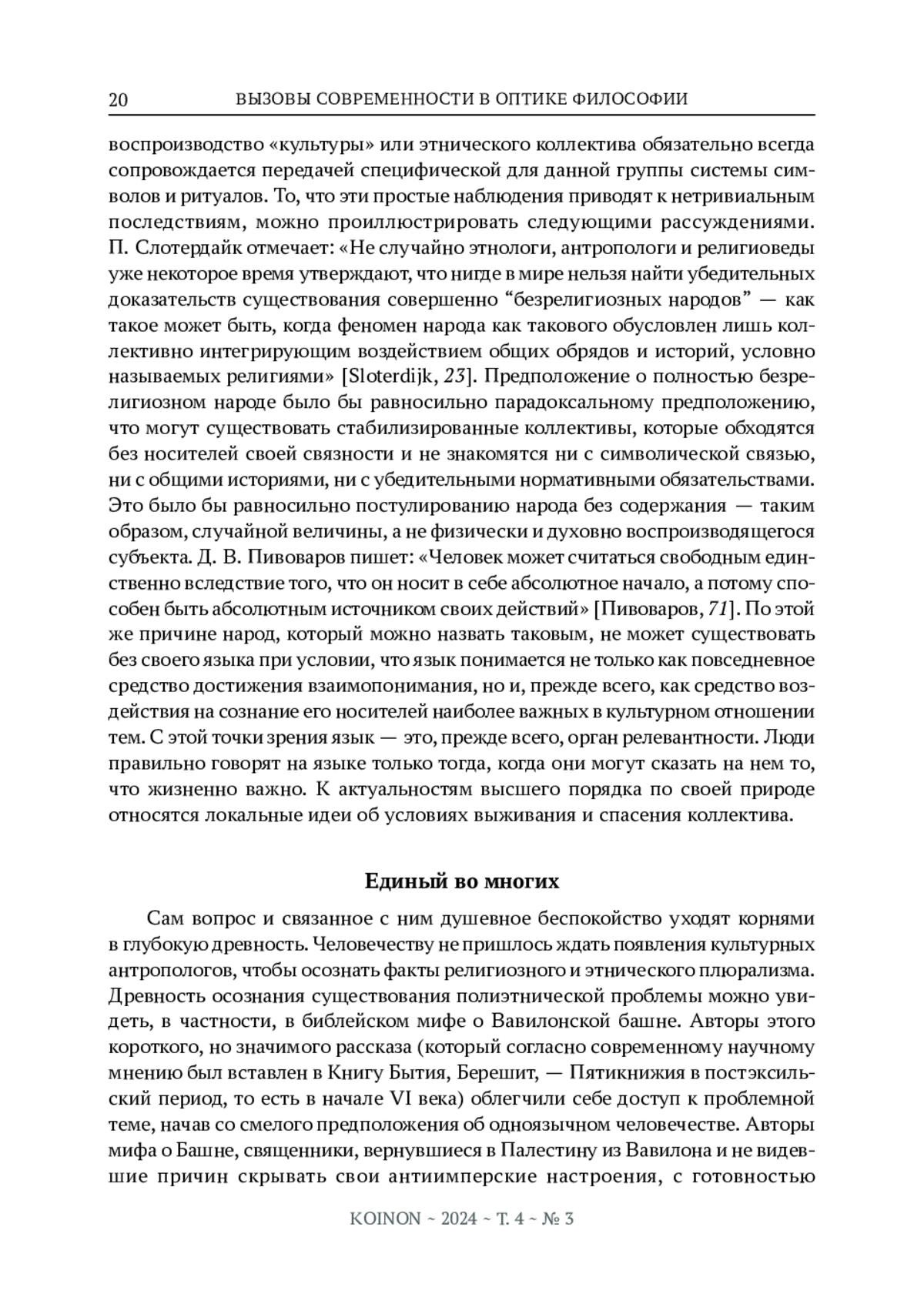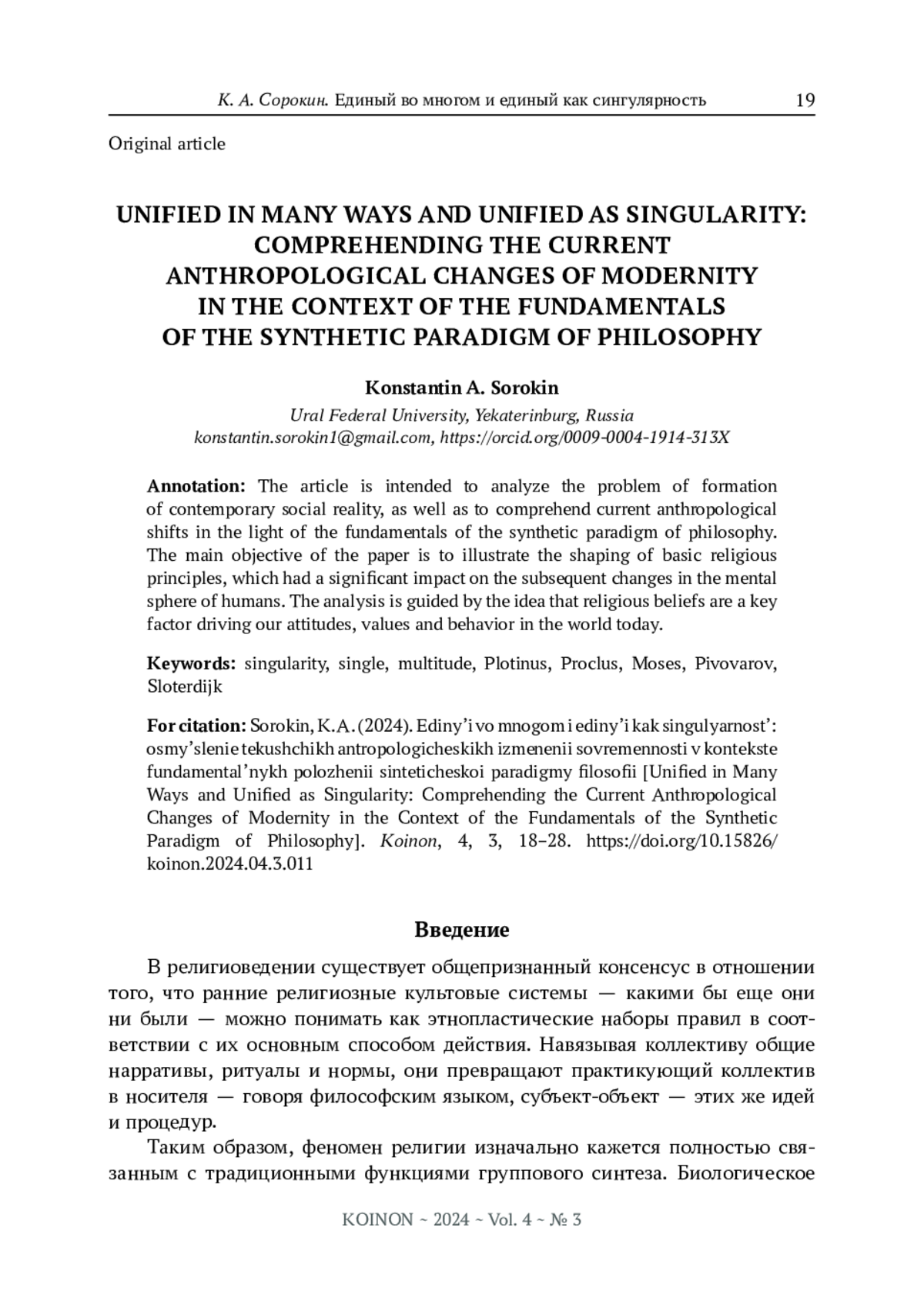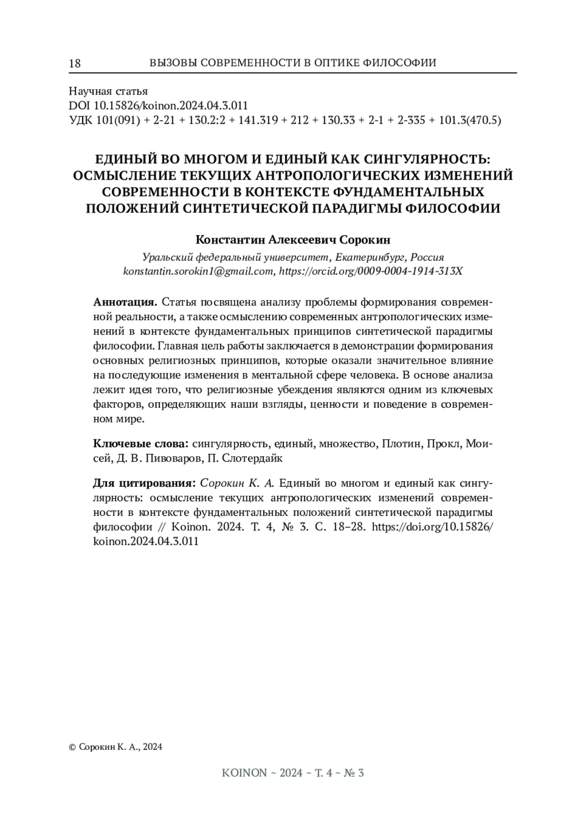 СОРОКИН К. А. ЕДИНЫЙ ВО МНОГОМ И ЕДИНЫЙ КАК СИНГУЛЯРНОСТЬ: ОСМЫСЛЕНИЕ ТЕКУЩИХ АНТРОПОЛОГИЧЕСКИХ ИЗМЕНЕНИЙ СОВРЕМЕННОСТИ В КОНТЕКСТЕ ФУНДАМЕНТАЛЬНЫХ ПОЛОЖЕНИЙ СИНТЕТИЧЕСКОЙ ПАРАДИГМЫ ФИЛОСОФИИ // KOINON. 2024. Т. 4 № 3