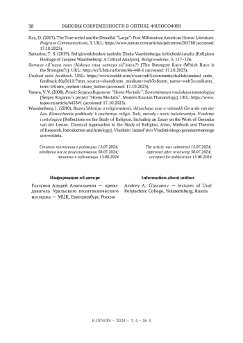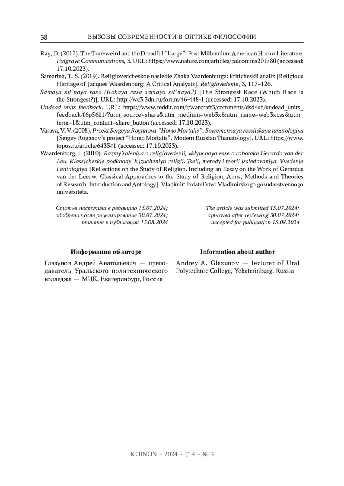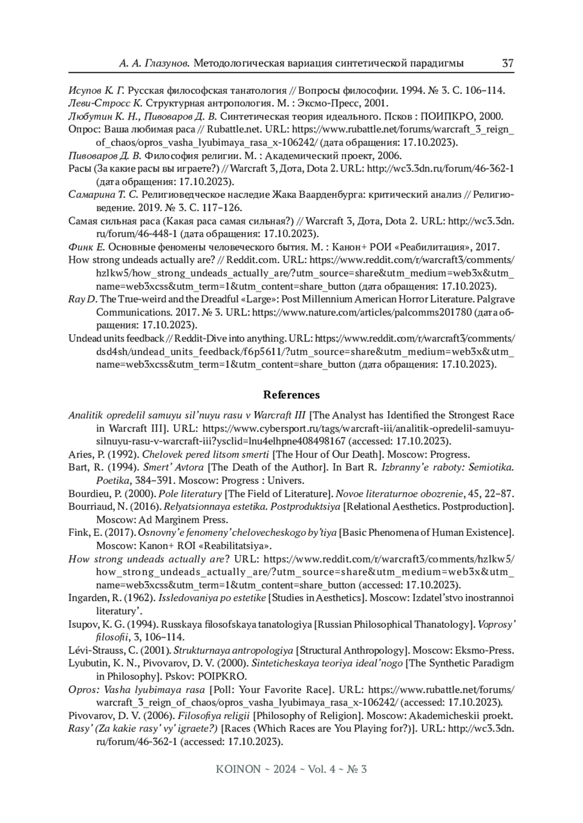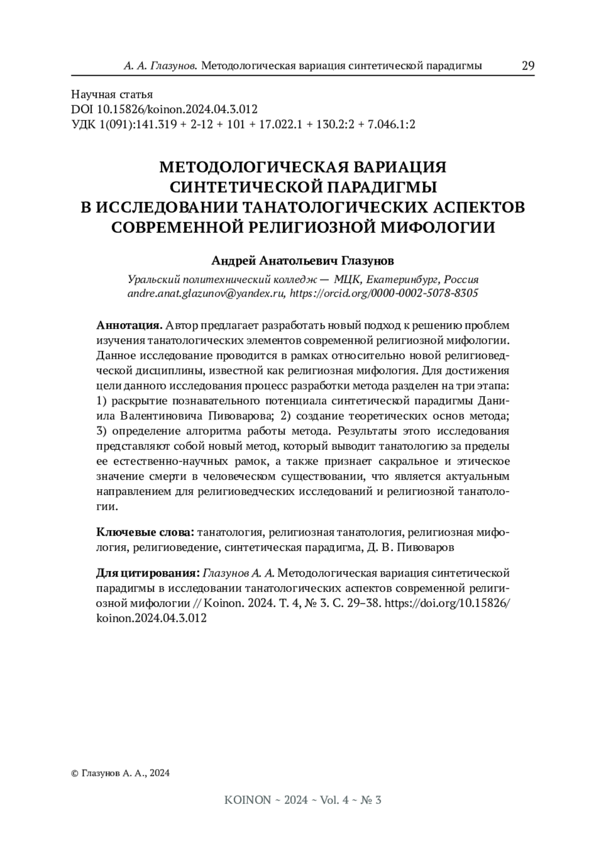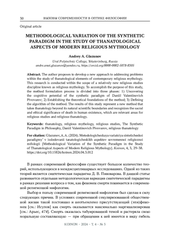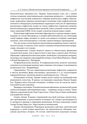 ГЛАЗУНОВ А. А. МЕТОДОЛОГИЧЕСКАЯ ВАРИАЦИЯ СИНТЕТИЧЕСКОЙ ПАРАДИГМЫ В ИССЛЕДОВАНИИ ТАНАТОЛОГИЧЕСКИХ АСПЕКТОВ СОВРЕМЕННОЙ РЕЛИГИОЗНОЙ МИФОЛОГИИ // KOINON. 2024. Т. 4 № 3