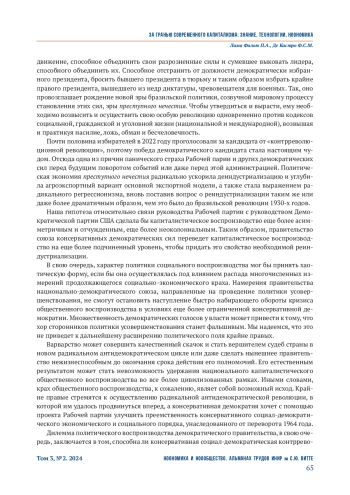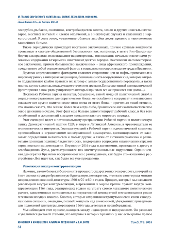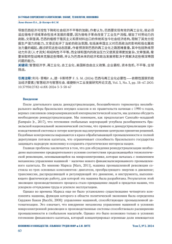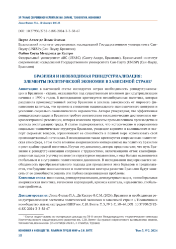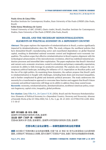 в настоящей статье исследуется острая необходимость реиндустриализации в Бразилии − стране, оказавшейся под существенным влиянием деиндустриализации начиная с 1990-х годов. В исследовании критикуется неолиберальная политика, которая разрушила производственный сектор Бразилии и усилила зависимость от мирового финансового капитала, что привело к снижению национального экономического контроля и усилению социально-экономического неравенства. Авторы утверждают, что эффективная реиндустриализация в Бразилии требует соответствия технологическим достижениям микроэлектронной революции, которая изменила процессы промышленного производства и усилила эксплуатацию труда. В статье подчеркивается, что исторические и современные социально-экономические структуры Бразилии, уходящие корнями в колониализм и экспорт сырьевых товаров, ограничивают ее способность в полной мере использовать свой производственный потенциал. В исследовании также критикуется современная политическая атмосфера, в том числе влияние американского империализма на политику Бразилии и рост крайне правой политики. Изучая эту динамику, авторы предполагают, что путь Бразилии к реиндустриализации сопряжен с трудностями, включающими отток квалифицированных кадров («утечку мозгов») и структурное неравенство, и еще больше осложняется глобальным и внутренним политическим давлением. В исследовании подчеркивается необходимость преобразовательного подхода для преодоления этих барьеров и предполагается, что будущие экономические и политические векторы развития Бразилии будут зависеть от ее способности решить эти глубоко укоренившиеся проблемы.