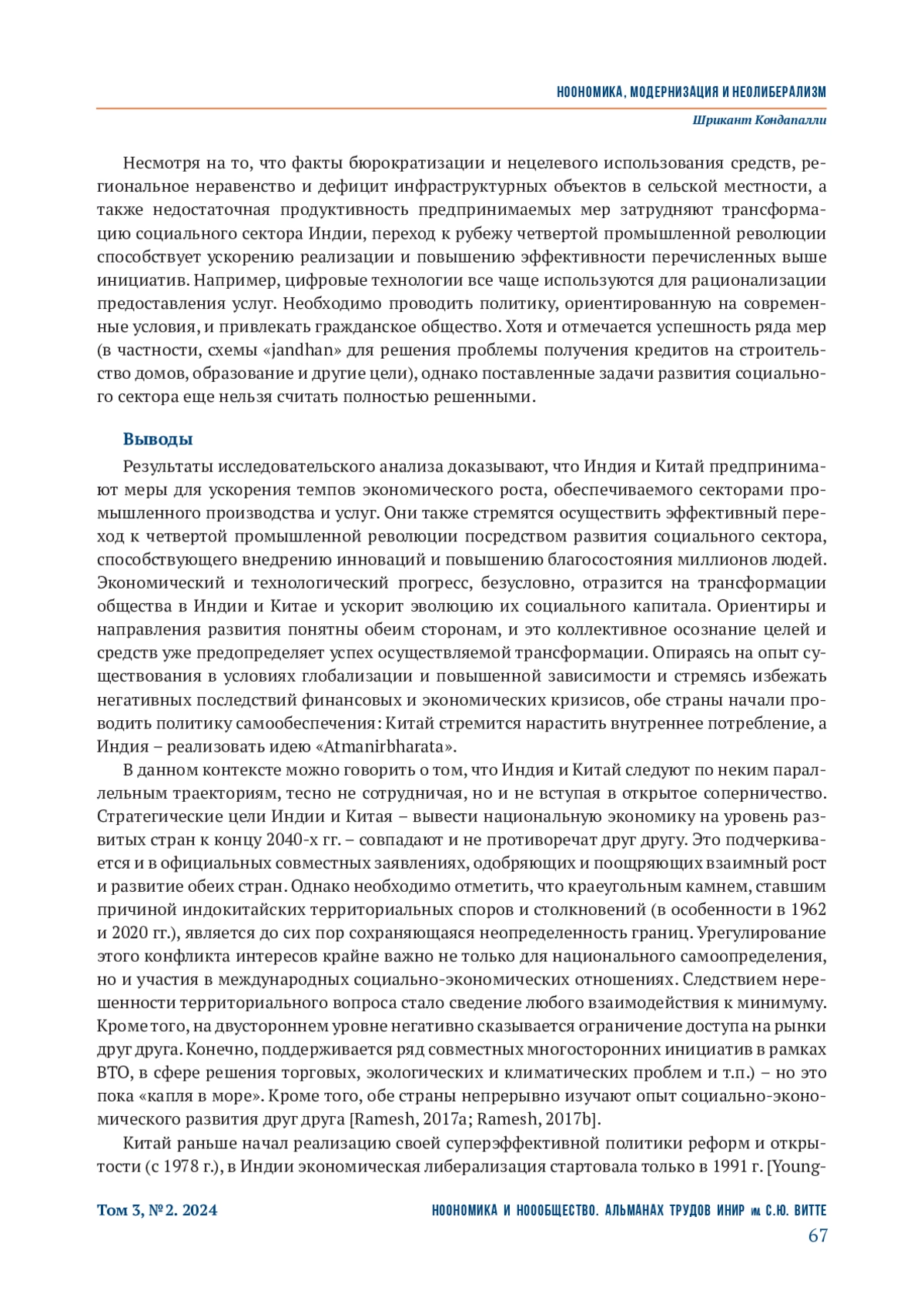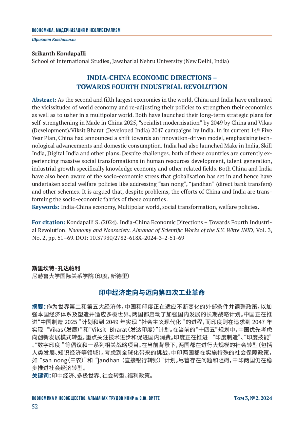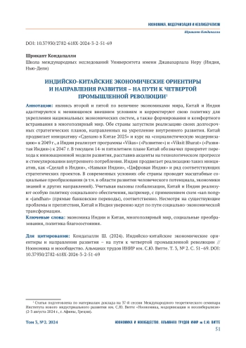 являясь второй и пятой по величине экономиками мира, Китай и Индия адаптируются к меняющимся внешним условиям и корректируют свою политику для укрепления национальных экономических систем, а также формирования и комфортного встраивания в многополярный мир. Обе страны запустили реализацию своих долгосрочных стратегических планов, направленных на укрепление внутреннего развития. Китай продвигает инициативу «Сделано в Китае 2025» и курс на «социалистическую модернизацию» к 2049 г., а Индия реализует программы «Vikas» («Развитие») и «Viksit Bharat» («Развитая Индия») к 2047 г. В текущем 14-м пятилетнем плане Китай обозначил приоритет перехода к инновационной модели развития, расставив акценты на технологическом прогрессе и стимулировании внутреннего потребления. Индия продвигает реализацию таких инициатив, как «Сделай в Индии», «Навыки Индии», «Цифровая Индия» и ряд соответствующих стратегических проектов. В современных условиях обе страны проводят масштабные социальные преобразования (в т. ч. в области развития человеческого потенциала, экономики знаний и других направлений). Учитывая вызовы глобализации, Китай и Индия реализуют особую политику социального обеспечения, например, с применением схем «san nong» и «jandhan» (прямые банковские переводы), соответственно. Несмотря на существующие проблемы и препятствия, Китай и Индия уверенно идут по пути социально-экономической трансформации.