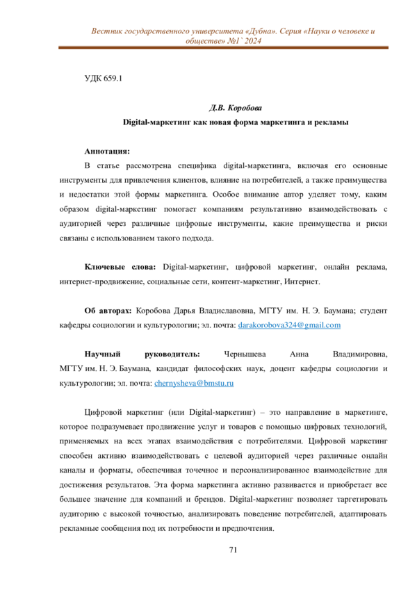 В статье рассмотрена специфика digital-маркетинга, включая его основные инструменты для привлечения клиентов, влияние на потребителей, а также преимущества и недостатки этой формы маркетинга. Особое внимание автор уделяет тому, каким образом digital-маркетинг помогает компаниям результативно взаимодействовать с аудиторией через различные цифровые инструменты, какие преимущества и риски связаны с использованием такого подхода.