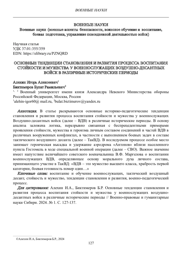 В статье раскрываются основные историко-педагогические тенденции становления и развития процесса воспитания стойкости и мужества у военнослужащих Воздушно-десантных войск (далее - ВДВ) в различные исторические периоды.