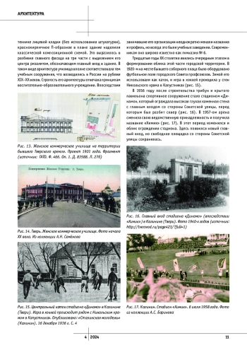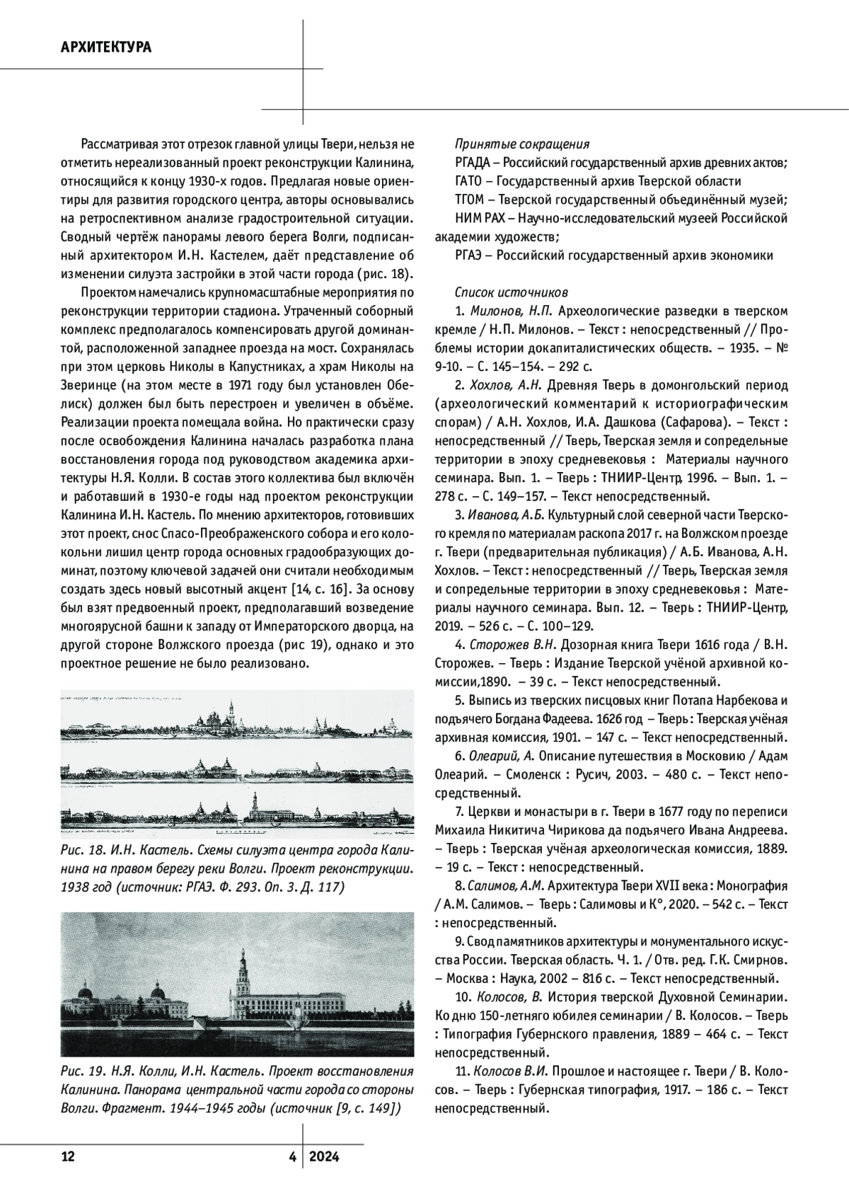 14. Колли Н., Кастель И. Архитектурные вопросы восстановления города Калинина / Н. Колли, И. Кастель. – Текст : непосредственный // Архитектура СССР. – 1946. – Вып. 12. – С. 6–16. – 56 с.