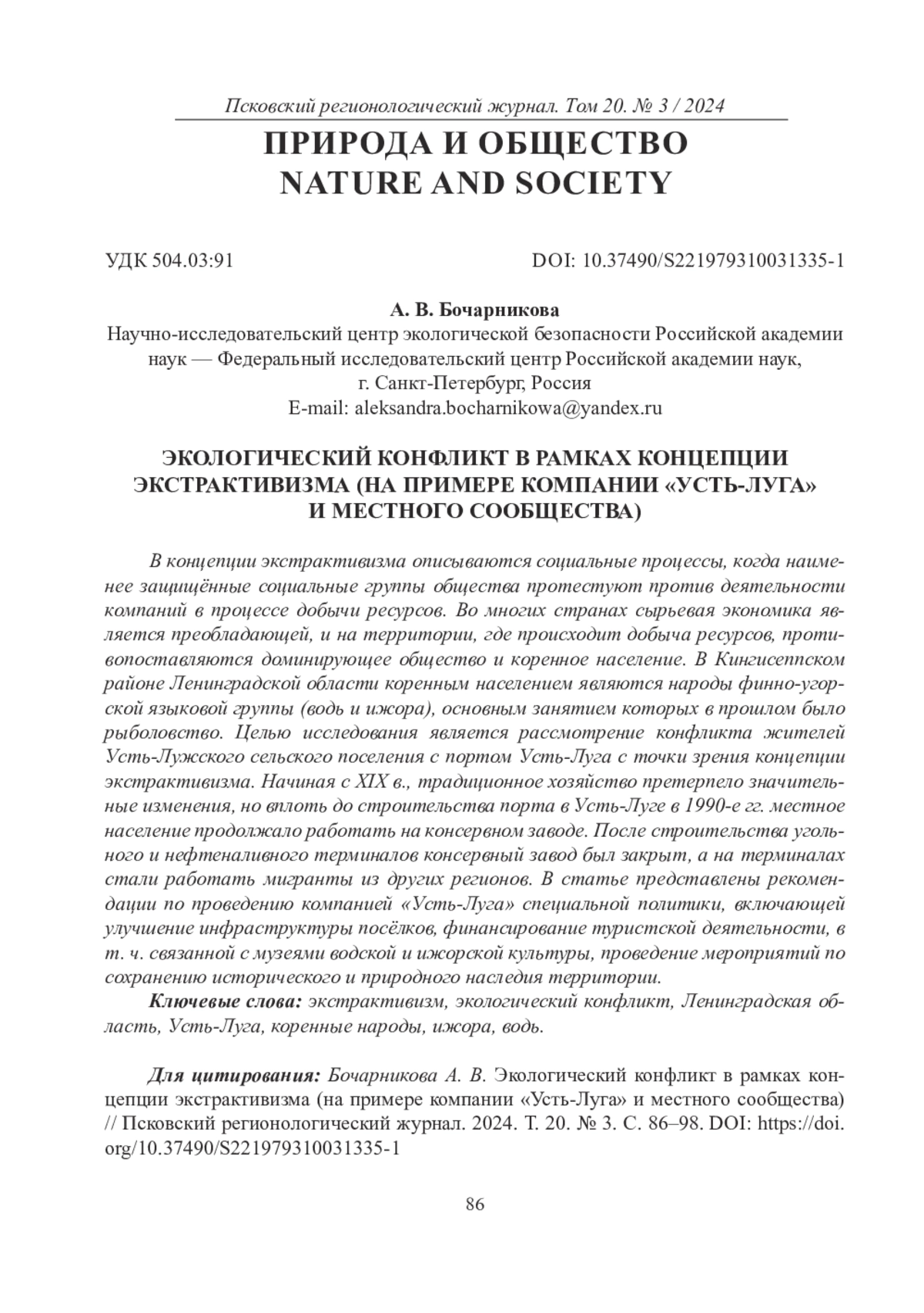 В концепции экстрактивизма описываются социальные процессы, когда наименее защищённые социальные группы общества протестуют против деятельности компаний в процессе добычи ресурсов. Во многих странах сырьевая экономика является преобладающей, и на территории, где происходит добыча ресурсов, противопоставляются доминирующее общество и коренное население. В Кингисеппском районе Ленинградской области коренным населением являются народы финно-угорской языковой группы (водь и ижора), основным занятием которых в прошлом было рыболовство. Целью исследования является рассмотрение конфликта жителей Усть-Лужского сельского поселения c портом Усть-Луга с точки зрения концепции экстрактивизма. Начиная с XIX в., традиционное хозяйство претерпело значительные изменения, но вплоть до строительства порта в Усть-Луге в 1990-е гг. местное население продолжало работать на консервном заводе. После строительства угольного и нефтеналивного терминалов консервный завод был закрыт, а на терминалах стали работать мигранты из других регионов. В статье представлены рекомендации по проведению компанией «Усть-Луга» специальной политики, включающей улучшение инфраструктуры посёлков, финансирование туристской деятельности, в т. ч. связанной с музеями водской и ижорской культуры, проведение мероприятий по сохранению исторического и природного наследия территории.