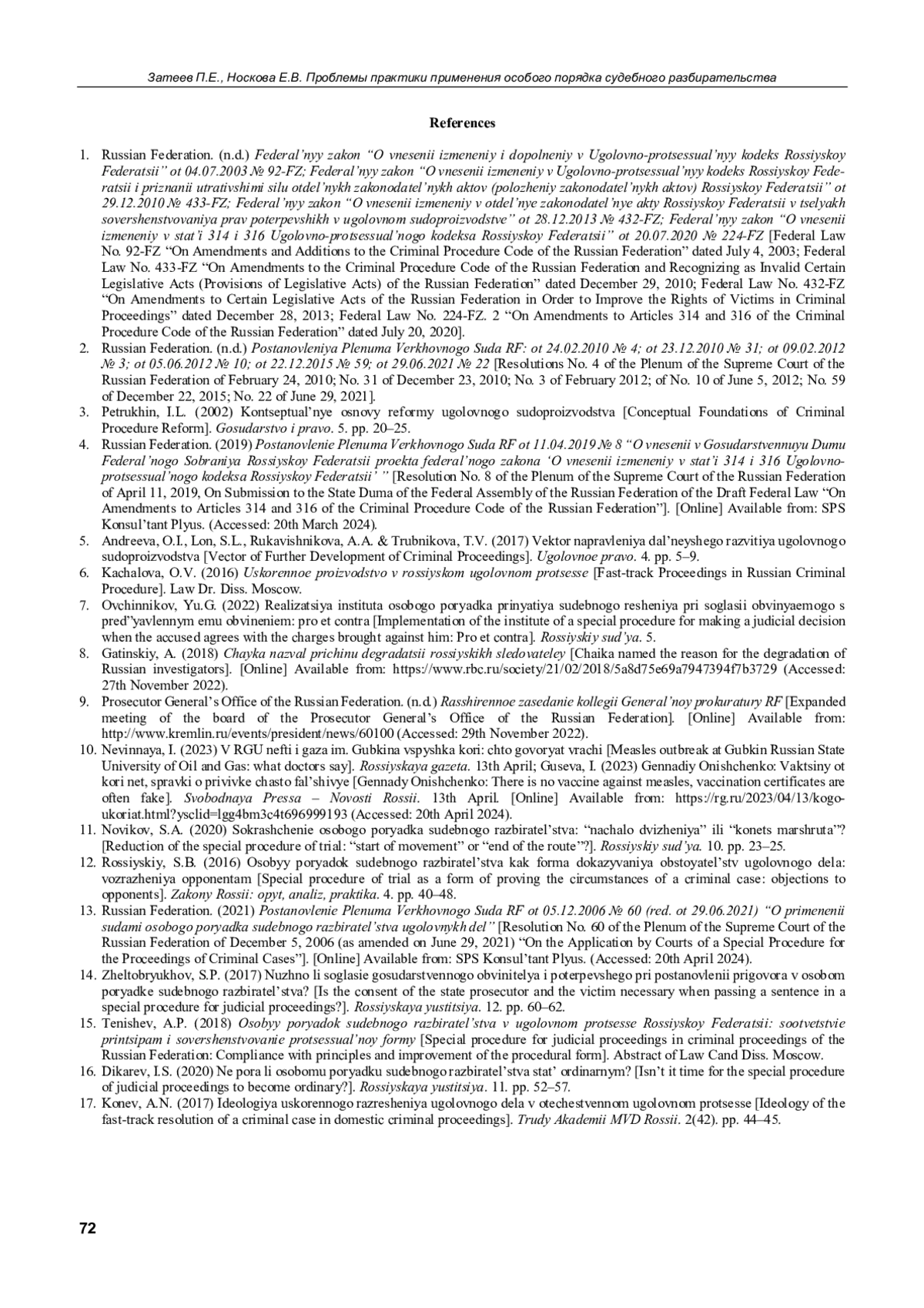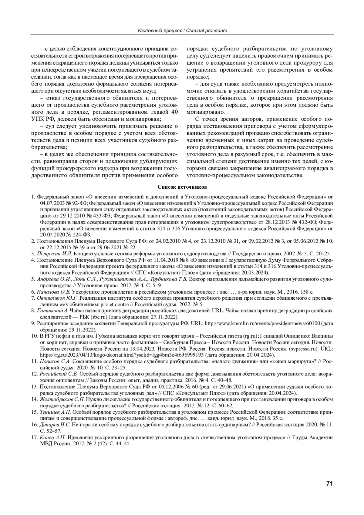 11. Новиков С.А. Сокращение особого порядка судебного разбирательства: “начало движения” или “конец маршрута”? // Российский судья. 2020. № 10. С. 23-25. EDN: JTWRXL