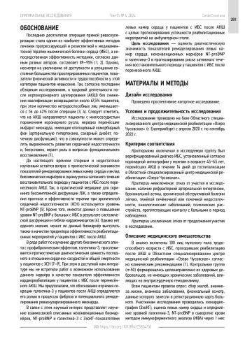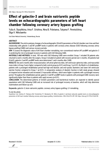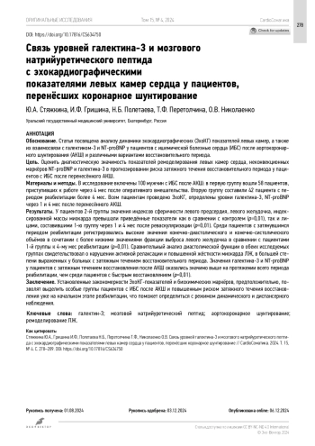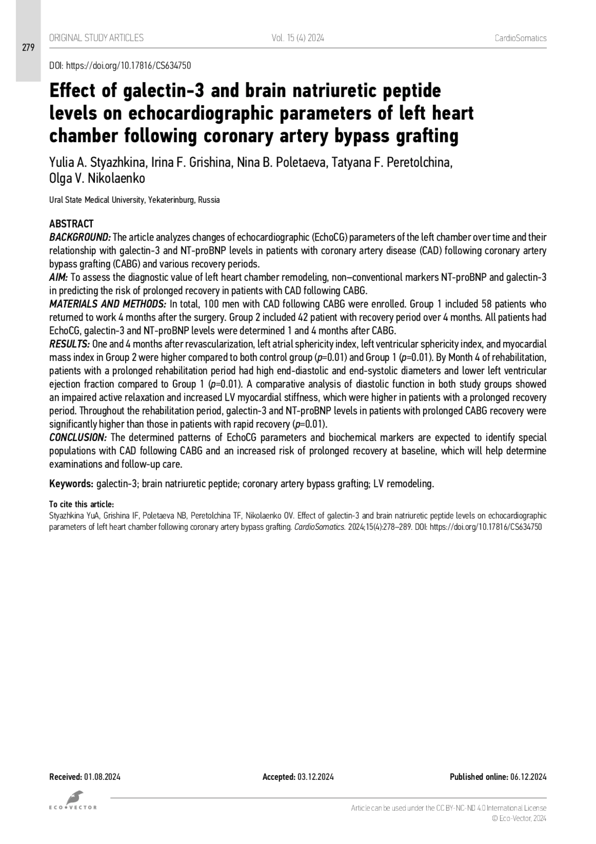 Обоснование. Статья посвящена анализу динамики эхокардиографических (ЭхоКГ) показателей левых камер, а также их взаимосвязи с галектином-3 и NT-proBNP у пациентов с ишемической болезнью сердца (ИБС) после аортокоронарного шунтирования (АКШ) и различными вариантами восстановительного периода
