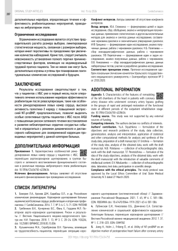Заключение. Установленные закономерности ЭхоКГ-показателей и биохимических маркёров, предположительно, позволят выделить особые группы пациентов с ИБС после АКШ и повышенным риском затяжного течения восстановления уже на начальном этапе реабилитации, что поможет определиться с режимом динамического и диспансерного наблюдения