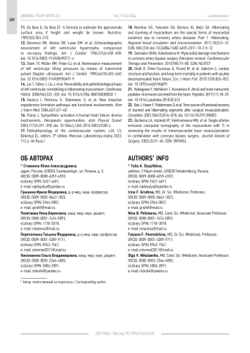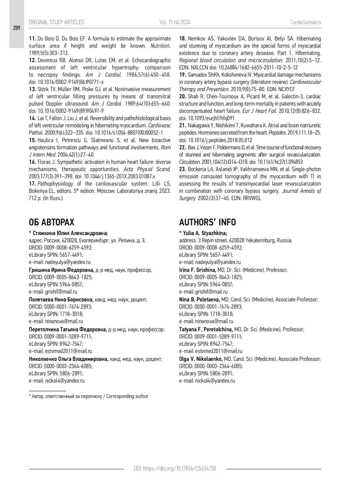 18. Немков А.С., Яковлев Д.А., Борисов А.И., Белый С.А. Гибернация и станнинг - особые формы существования миокарда при ишемической болезни сердца. Часть 1. Гибернация // Регио- нарное кровообращение и микроциркуляция. 2011. Т. 10, № 2. С. 5–12. EDN: NXLCCN doi: 10.24884/1682-6655-2011-10-2-5-12