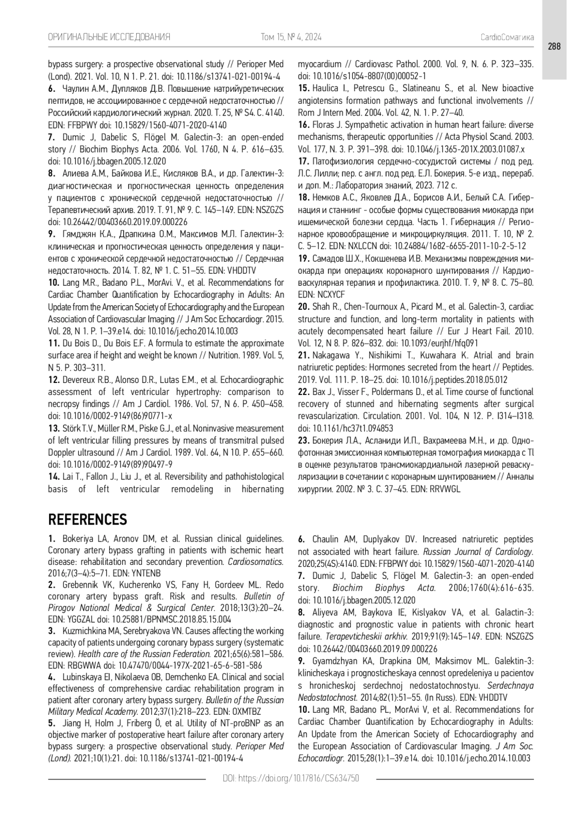 5. Jiang H., Holm J., Friberg Ö., et al. Utility of NT-proBNP as an objective marker of postoperative heart failure after coronary artery bypass surgery: a prospective observational study // Perioper Med (Lond). 2021. Vol. 10, N 1. P. 21. doi: 10.1186/s13741-021-00194-4