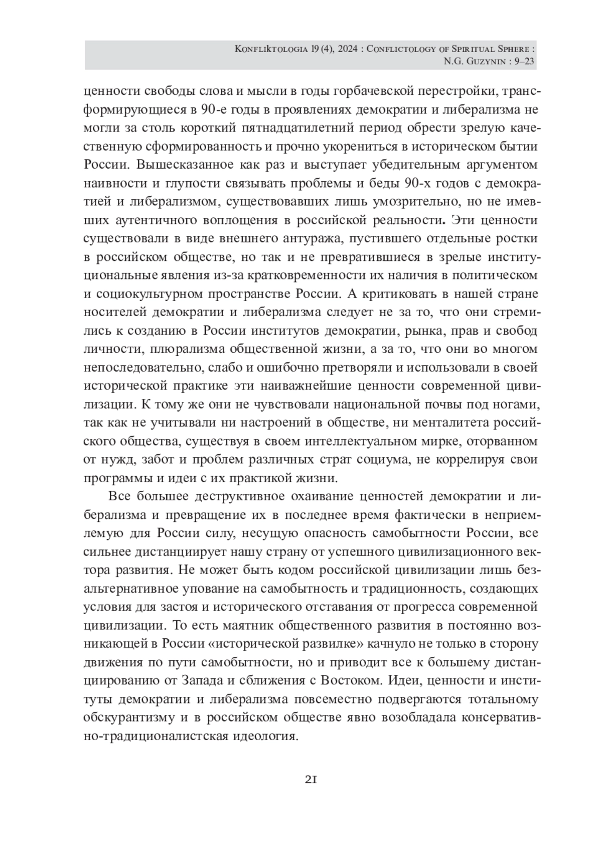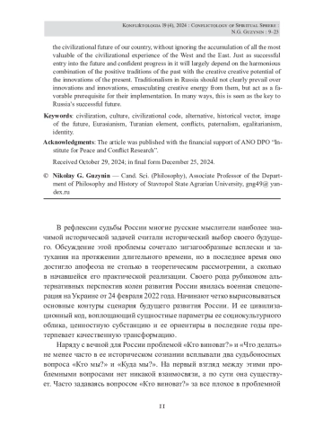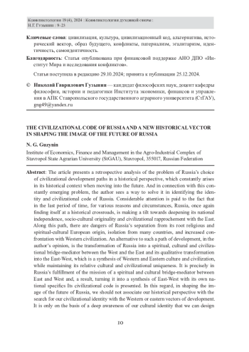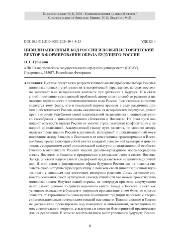 В статье представлен ретроспективный анализ проблемы выбора Россией цивилизационных путей развития в исторической перспективе, которая постоянно возникает в ее историческом контексте при движении в будущее. И в связи с этой, постоянно возникающей проблемой, автор видит способ ее решения в выявлении идентичности и цивилизационного кода России. Значительное внимание уделяется тому факту, что в последний период времени в силу различных причин и обстоятельств Россия, вновь оказавшись на историческом перепутье, делает крен в сторону углубления своей национальной независимости, социокультурного своеобразия и цивилизационного сближения с Востоком. На этом пути возникают опасности отрыва России от многих стран, усиления конфронтации с западной цивилизацией. Альтернативой такому пути развития, по мнению автора, является превращение России в духовный, культурный и цивилизационный мост-посредник между Западом и Востоком и ее качественная трансформация в Востоко-Запад, представляющая собой синтез западной и восточной культуры и цивилизации, с сохранением своей относительной культурно-цивилизационной особости. Именно в выполнении Россией миссии духовно-культурного моста-посредника между Востоком и Западом и превращении в результате этого в синтез Востоко-Запада со своей национальной спецификой представляется ее цивилизационный код. В этой связи в формировании образа будущего России мы не должны связывать свою историческую перспективу с поиском своей цивилизационной идентичности с западным или восточным векторами развития. Лишь на основе глубокого осознания своей культурной самоидентичности мы можем проектировать цивилизационное будущее нашей страны, не игнорируя при этом аккумуляцию всего самого ценного из цивилизационного опыта Запада и Востока. Также как успешное вхождение в будущее и уверенное продвижение в нем будет во многом зависеть от гармоничного совмещения позитивных традиций прошлого с творческим созидательным потенциалом новаций настоящего. Традиционализм в России не должен явно превалировать над новациями и инновациями, выхолащивая из них созидательную энергию, а выступать в качестве благоприятной предпосылки для их реализации. В этом во многом видится залог успешного будущего России.