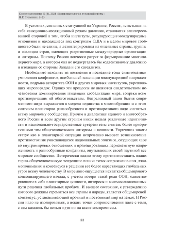 На основе структурно-реалистического подхода анализируется концептуально и методологически значимая проблема глобальной конфликтности как фактора углубления кризиса функционирующего постбиполярного миропорядка. В качестве стержня этой проблемы рассматривается разлом мира на две составные части: с одной стороны, Запад и Украина, с другой - Китай и Россия. Противостояние по линии Россия - Запад, по мнению автора, проистекает из хаотичности и незавершенности процесса распада биполярной системы, создавшего ситуацию «отложенного конфликта» в российско-украинских отношениях. Столкновение носит характер одновременно геополитического, вызванного преимущественно территориальными аспектами национальной самоидентификации, и ценностного, сопровождающегося демонизацией противоположной стороны. Американо-китайское соперничество в сочетании с растущей взаимозависимостью государств во многом определяет перспективы мирового развития. В качестве наиболее значимых составляющих реальной и потенциальной конфликтности рассматриваются гибридность международных конфликтов, обострение соперничества центров силы из-за практически ничейных пространств и сфер деятельности, конкуренция внешних акторов на пространстве СССР в условиях существующей геополитической неопределенности. Акцентируется возрастание роли силового фактора в международных отношениях, включая войну как способ и средство укрепления позиций тех или иных государств. Основываясь на существующих экспертных оценках, раскрывается влияние глобальной конфликтности на снижение управляемости мировой политики и хаотизацию международной среды. Высказывается авторское мнение о возможных перспективах развития мировой динамики, сопряженных с тектоническими сдвигами в соотношении и расстановке сил на международной арене, нарастающей волной межгосударственных и внутригосударственных конфликтов, переформатированием политических пространств. В качестве вероятных сценариев трансформации мира прогнозируются полицентричность с элементами биполярности (США-Китай) и хаотизация международной среды («международный беспорядок»).