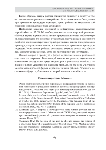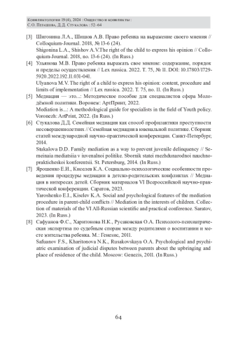 Yaroshenko E.I., Kiselev K.A. Social and psychological features of the mediation procedure in parent-child conflicts // Mediation in the interests of children. Collection of materials of the VI All-Russian scientific and practical conference. Saratov, 2023. (In Russ.).