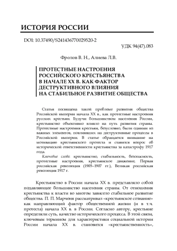 Статья посвящена такой проблеме развития общества Российской империи начала ХХ в., как протестные настроения русских крестьян. Будучи большинством населения России, крестьянство объективно влияло на путь развития страны. Протестные настроения крестьян, безусловно, были одними из важных элементов, повлиявших на деструктивные процессы в Российской империи. В статье обращается внимание на мотивацию крестьянского протеста и ставится вопрос об исторической ответственности крестьянства за катастрофу 1917 года.