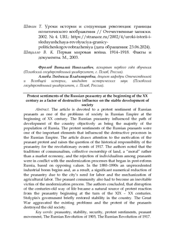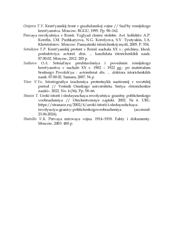 14. 	Сотникова Т. П. Крестьянский протест в России начала XX в.: причины, ход, последствия: автореф. дисс.... кандидата исторических наук: 07.00.02. М., 2012. EDN: QFSOLF