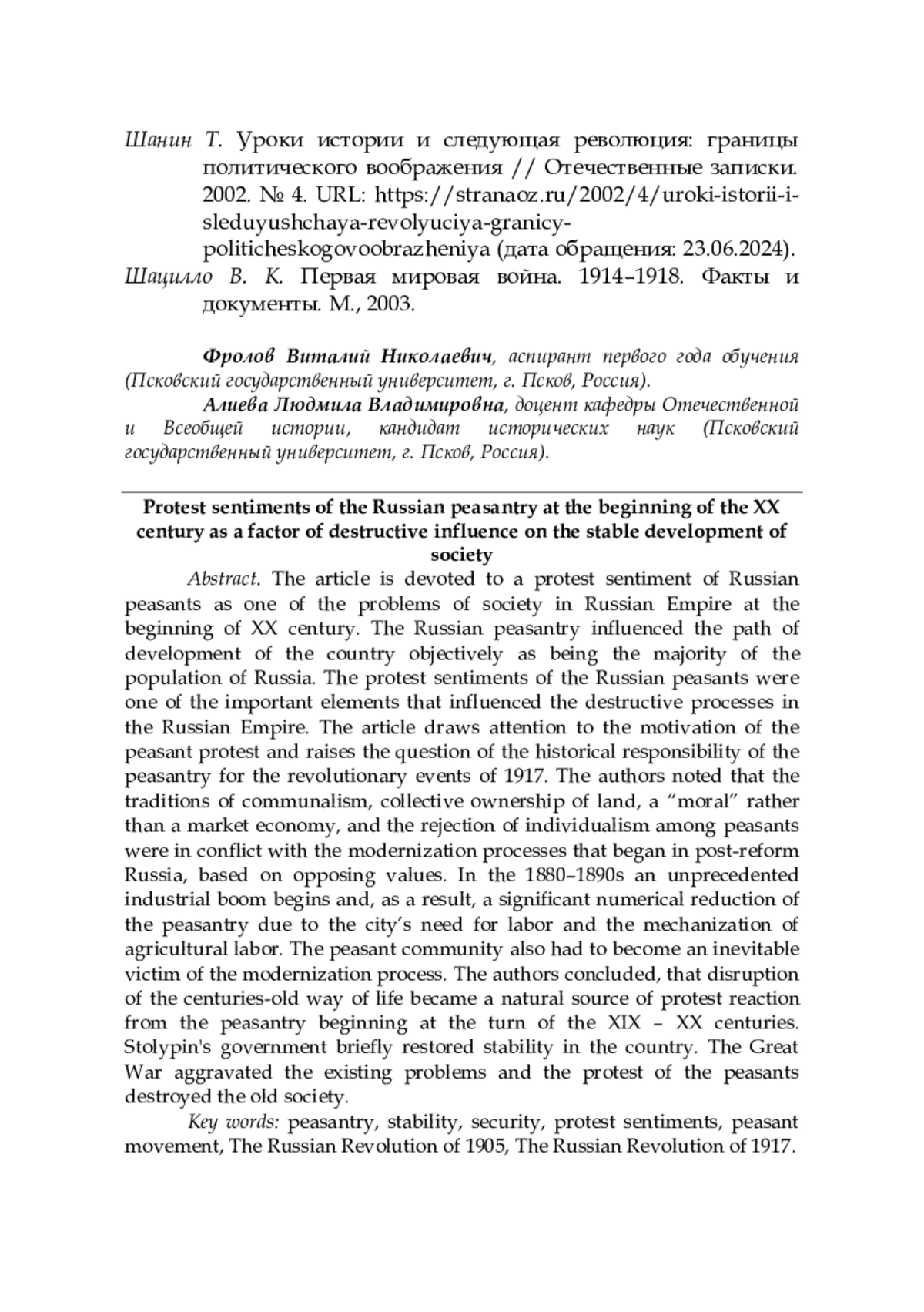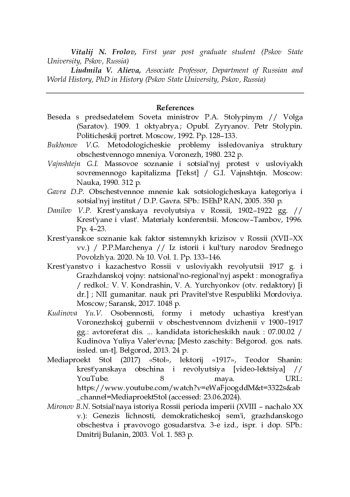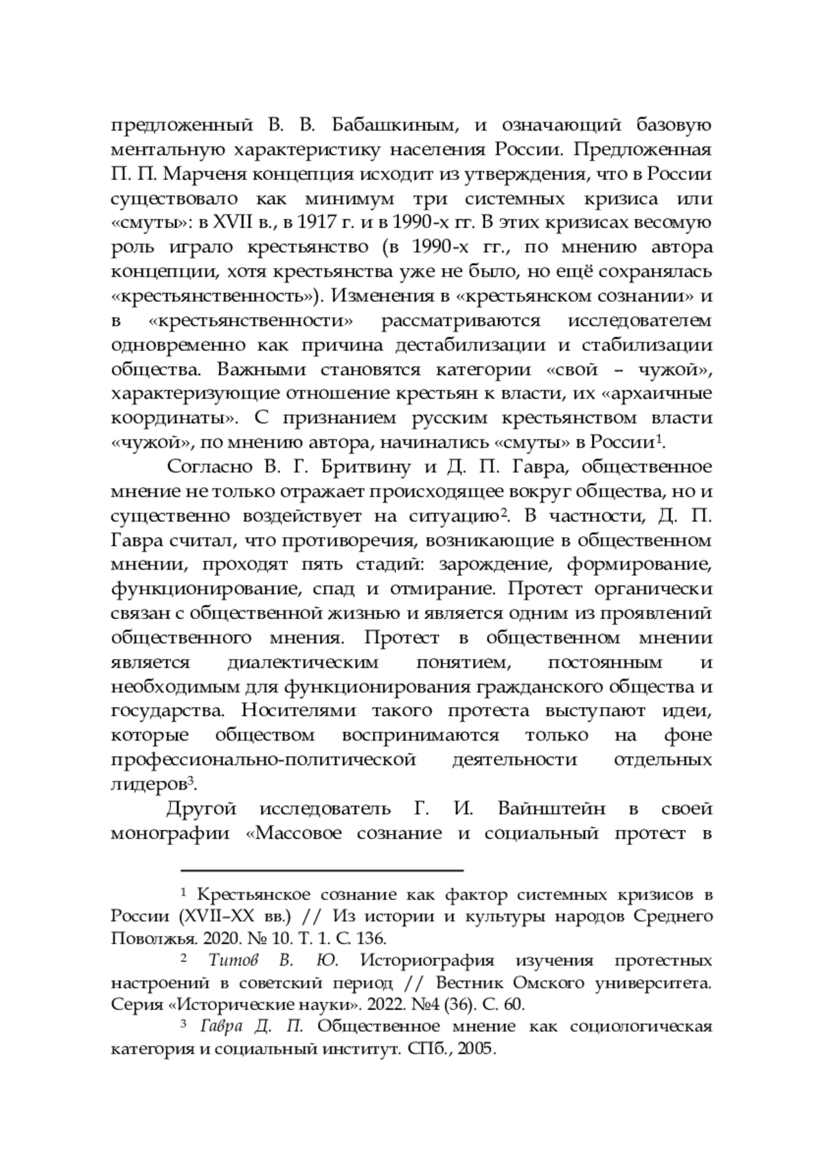 6. 	Марченя П. П. Крестьянское сознание как фактор системных кризисов в России (XVII-XX вв.) // Из истории и культуры народов Среднего Поволжья. 2020. № 10. EDN: JBOCYO