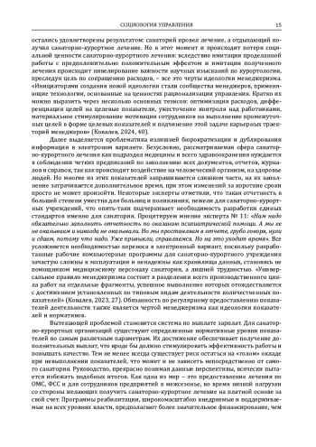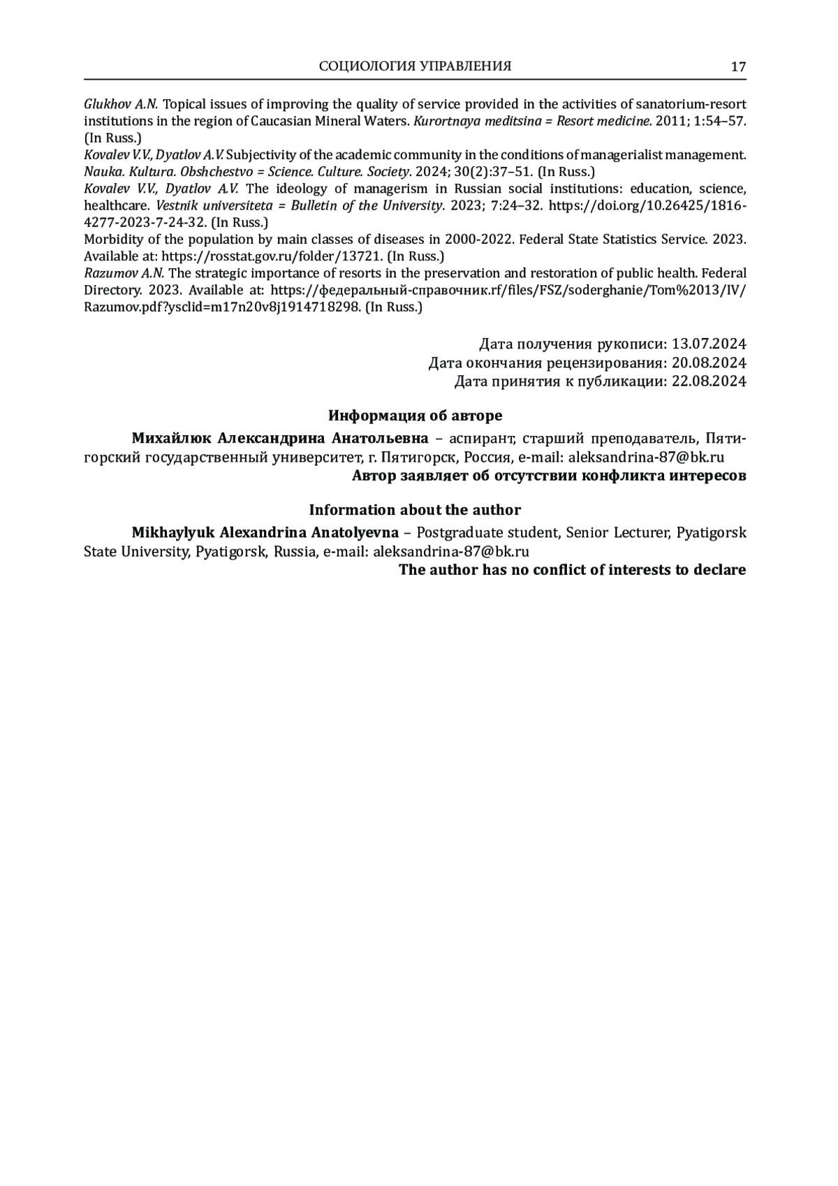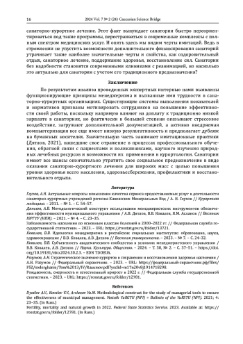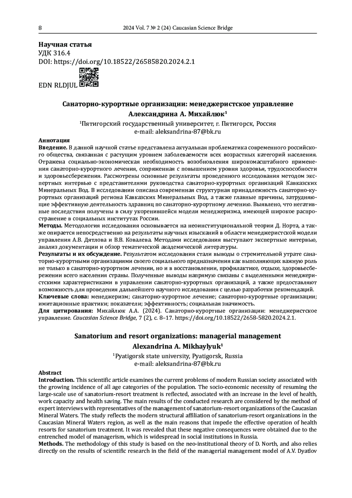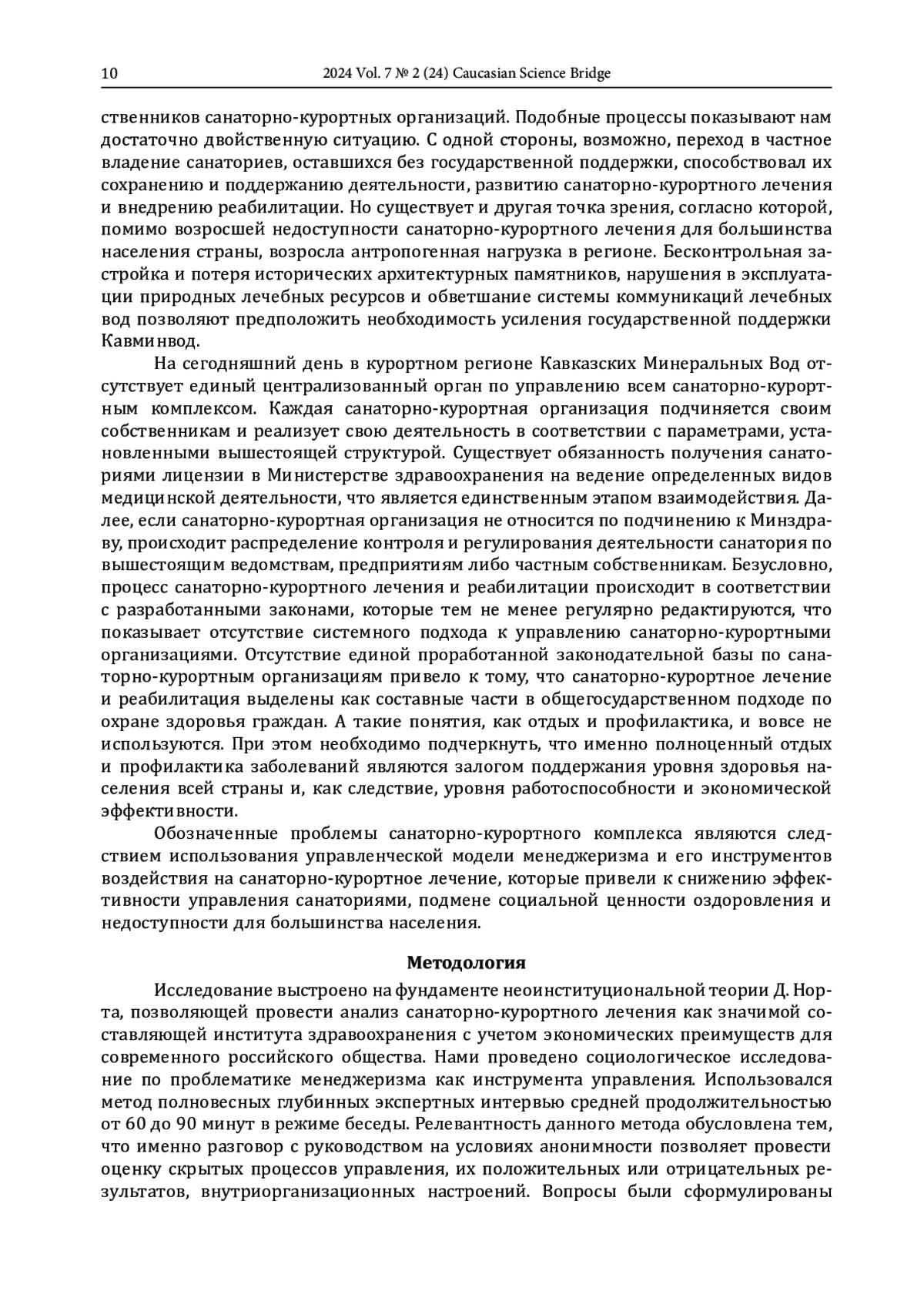 Введение. В данной научной статье представлена актуальная проблематика современного российского общества, связанная с растущим уровнем заболеваемости всех возрастных категорий населения. Отражена социально-экономическая необходимость возобновления широкомасштабного применения санаторно-курортного лечения, сопряженная с повышением уровня здоровья, трудоспособности и здоровьесбережения. Рассмотрены основные результаты проведенного исследования методом экспертных интервью с представителями руководства санаторно-курортных организаций Кавказских Минеральных Вод. В исследовании описана современная структурная принадлежность санаторно-курортных организаций региона Кавказских Минеральных Вод, а также главные причины, затрудняющие эффективную деятельность здравниц по санаторно-курортному лечению. Выявлено, что негативные последствия получены в силу укоренившейся модели менеджеризма, имеющей широкое распространение в социальных институтах России.