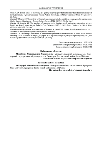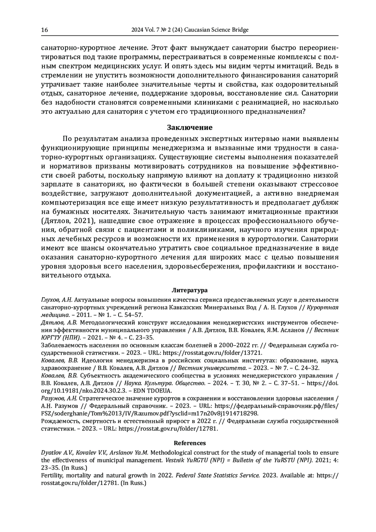 - Ковалев, В.В. Идеология менеджеризма в российских социальных институтах: образование, наука, здравоохранение / В.В. Ковалев, А.В. Дятлов // Вестник университета. – 2023. – № 7. – С. 24–32.