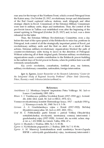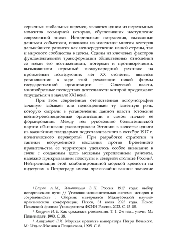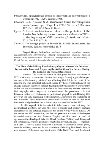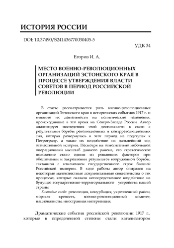 В статье рассматривается роль военно-революционных организаций Эстонского края в исторических событиях 1917 г. и влияние их деятельности на политические изменения, происходившие в это время на Северо-Западе России. Автор анализирует последствия этой деятельности в связи с результатами борьбы революционных и контрреволюционных сил, которая развернулась в этот период на подступах к Петрограду, а также их воздействие на дальнейший ход отечественной истории. Несмотря на относительно небольшой операционный масштаб данного района, его стратегическое положение стало одним из решающих факторов при обеспечении и закреплении результатов вооруженной борьбы, связанной с изменением государственного строя бывшей Российской империи. В ходе работы автор опирался на некоторые малоизвестные документальные свидетельства о тех процессах, которые оказали непосредственное воздействие на будущее государственно-территориального устройства нашей страны.