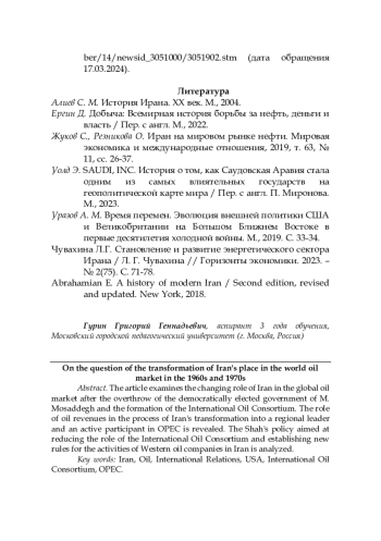 В статье рассматривается изменение роли Ирана на глобальном рынке нефти после свержения демократически избранного правительства М. Мосаддыка и образования Международного нефтяного консорциума. Раскрывается роль нефтяных доходов в процессе превращения Ирана в регионального лидера и активного участника ОПЕК. Проанализирована политика шаха, направленная на сокращение роли Международного нефтяного консорциума и установление новых правил деятельности западных нефтяных компаний в Иране.
