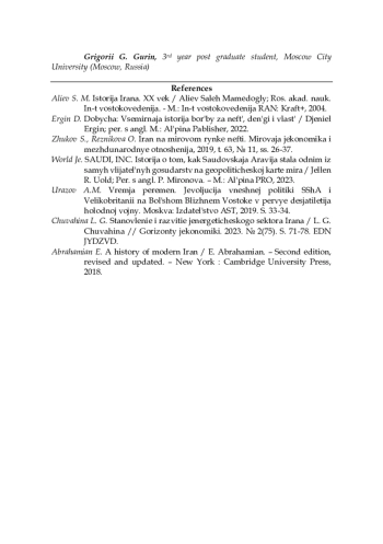 13. 	Чувахина Л.Г. Становление и развитие энергетического сектора Ирана / Л. Г. Чувахина // Горизонты экономики. 2023. - № 2(75). С. 71-78. EDN: JYDZVD