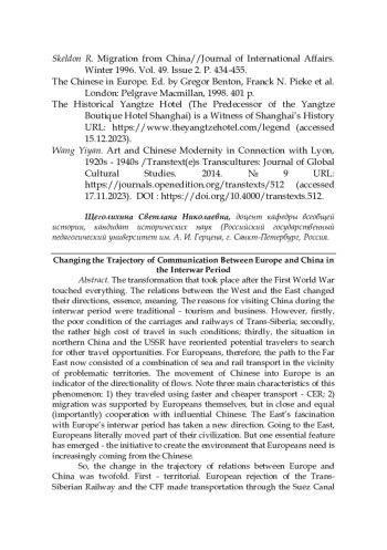 На основе системно-сравнительного анализа рассматривается проблема изменения взаимоотношений «Восток-Запад» в межвоенный период. Предметом исследования является система связи Европы и Китая; объектом выступает изменение отношений между двумя культурами в межвоенный период. На основе разных типов источников, в числе которых путеводители и другие справочники, визуальные материалы, документы личного происхождения и т. п., делается вывод о сущностном изменении системы взаимоотношений между Китаем и Европой
