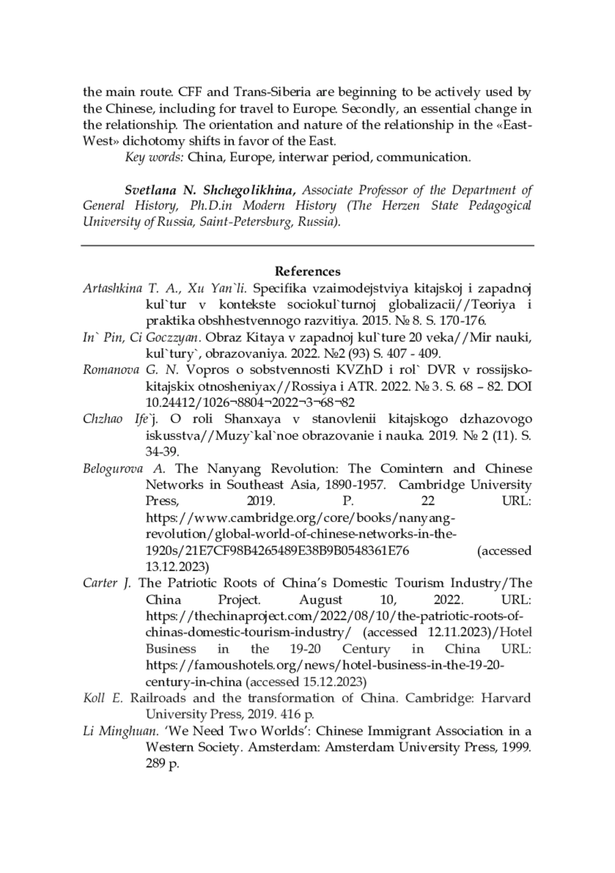 19. Belogurova A. The Nanyang Revolution: The Comintern and Chinese Networks in Southeast Asia, 1890-1957. Cambridge University Press, 2019. P. 22 URL: https://www.cambridge.org/core/books/nanyang-revolution/global-world-of-chinese-networks-in-the-1920s/21E7CF98B4265489E38B9B0548361E76 (accessed 13.12.2023). DOI: 10.1017/9781108635059.002