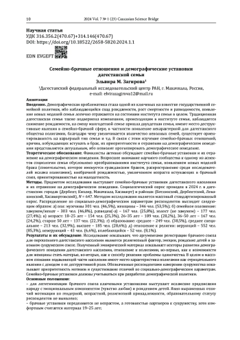 Демографическая проблематика стала одной из ключевых на повестке государственной семейной политики, ибо наблюдающийся спад рождаемости, рост смертности и разводимости, появление новых моделей семьи логично отражаются на состоянии института семьи в целом. Традиционная дагестанская семья также подвержена изменениям, происходящим в институте семьи, наблюдается снижение рождаемости, на смену многодетной семье пришла двухдетная семья, имеют место деструктивные явления в семейно-брачной сфере, в частности появление нехарактерной для дагестанского общества полигамии, благодаря чему увеличивается количество неполных семей, существует ориентированность на карьерный тип семьи и т. д. В связи с этим изучение семейно-брачных отношений, причин, побуждающих вступать в брак, их приоритетности и отражения на демографическом поведении представляется актуальным, ибо позволит прогнозировать демографическое поведение.