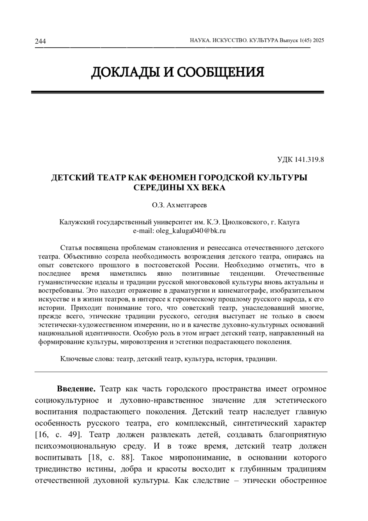 9. Казанцева, А. Е. Театр для детей и юношества в контексте времени на примере творческой деятельности РАМТа и его художественного руководителя А. В. Бородина / А. Е. Казанцева // Молодой ученый - перспективная наука: сборник статей. - Москва: Российский институт театрального искусства - ГИТИС, 2023. - С. 59-63. EDN: UHIMKK
