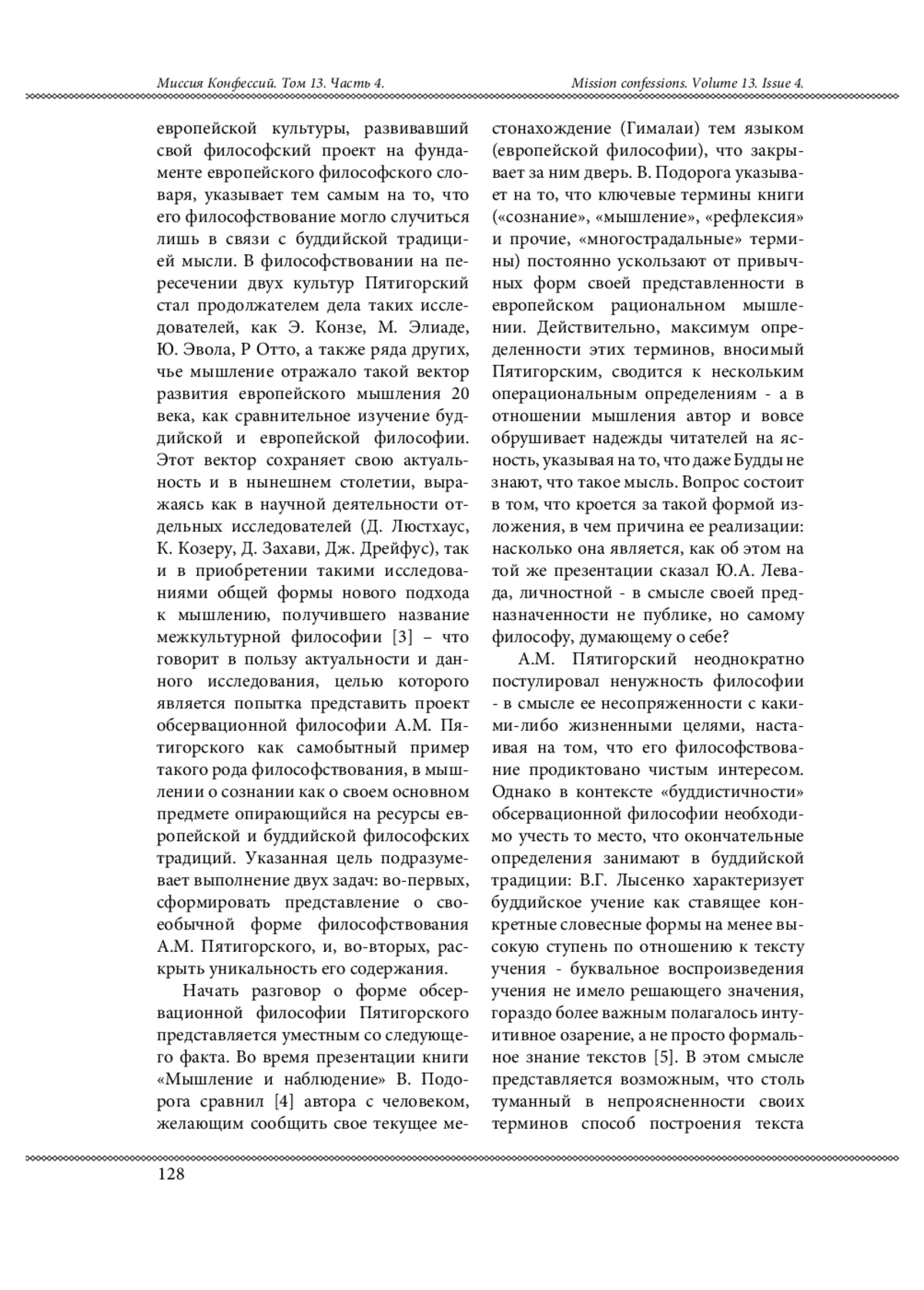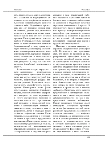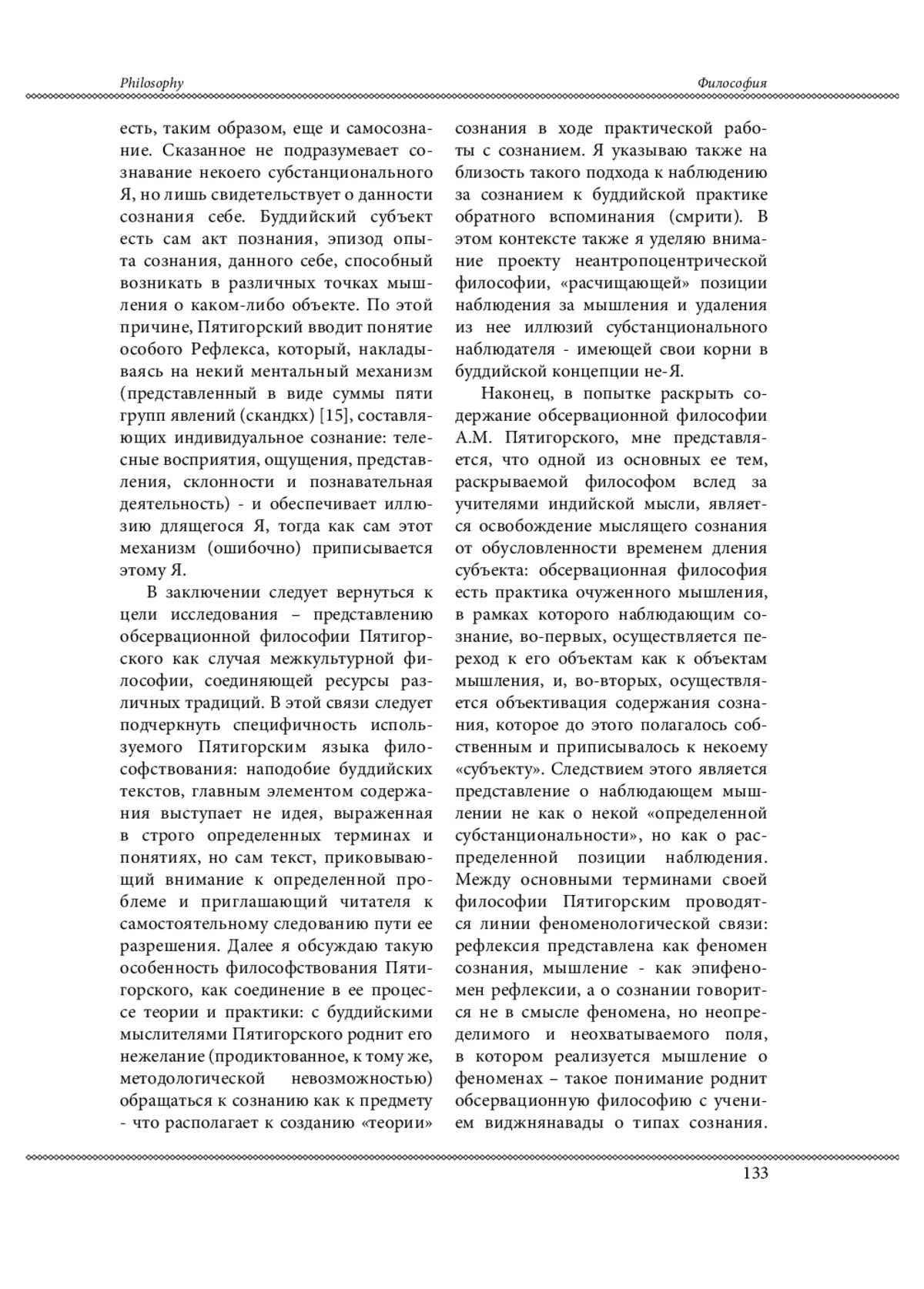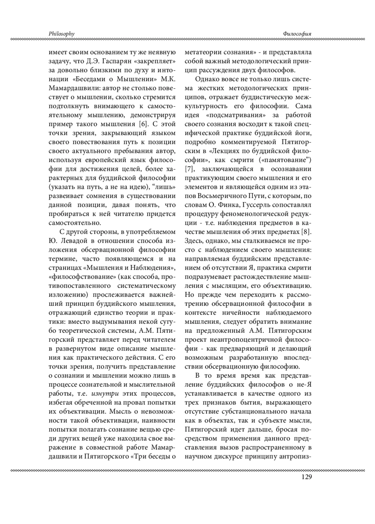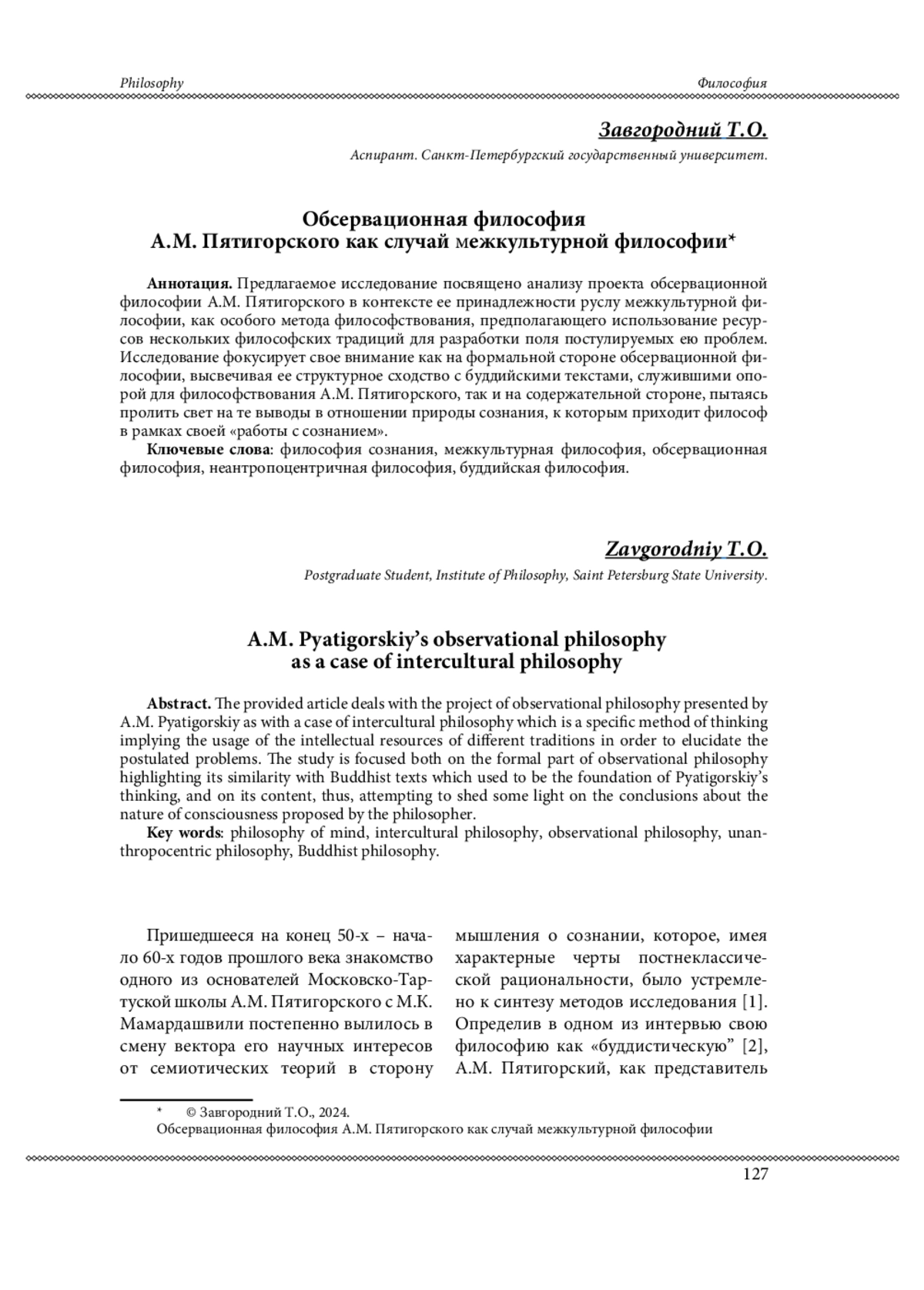Предлагаемое исследование посвящено анализу проекта обсервационной философии А. М. Пятигорского в контексте ее принадлежности руслу межкультурной философии, как особого метода философствования, предполагающего использование ресурсов нескольких философских традиций для разработки поля постулируемых ею проблем. Исследование фокусирует свое внимание как на формальной стороне обсервационной философии, высвечивая ее структурное сходство с буддийскими текстами, служившими опорой для философствования А. М. Пятигорского, так и на содержательной стороне, пытаясь пролить свет на те выводы в отношении природы сознания, к которым приходит философ в рамках своей «работы с сознанием».
