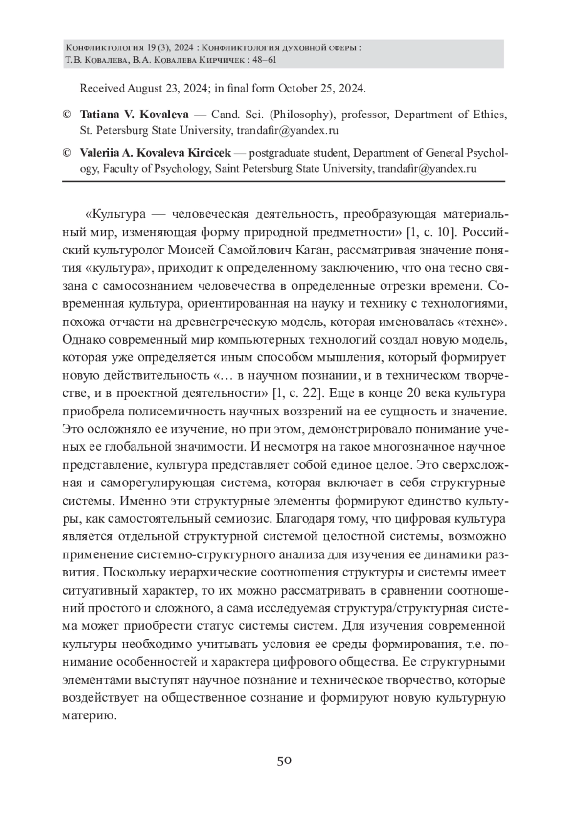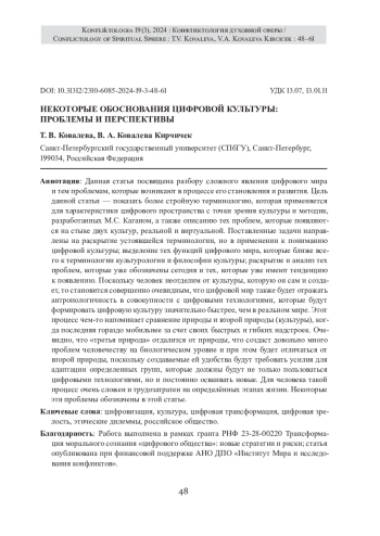 Данная статья посвящена разбору сложного явления цифрового мира и тем проблемам, которые возникают в процессе его становления и развития. Цель данной статьи - показать более стройную терминологию, которая применяется для характеристики цифрового пространства с точки зрения культуры и методик, разработанных М. С. Каганом, а также описанию тех проблем, которые появляются на стыке двух культур, реальной и виртуальной. Поставленные задачи направлены на раскрытие устоявшейся терминологии, но в применении к пониманию цифровой культуры; выделение тех функций цифрового мира, которые ближе всего к терминологии культурологии и философии культуры; раскрытие и анализ тех проблем, которые уже обозначены сегодня и тех, которые уже имеют тенденцию к появлению. Поскольку человек неотделим от культуры, которую он сам и создает, то становится совершенно очевидным, что цифровой мир также будет отражать антропологичность в совокупности с цифровыми технологиями, которые будут формировать цифровую культуру значительно быстрее, чем в реальном мире. Этот процесс чем-то напоминает сравнение природы и второй природы (культуры), когда последняя гораздо мобильнее за счет своих быстрых и гибких надстроек. Очевидно, что «третья природа» отдалится от природы, что создаст довольно много проблем человечеству на биологическом уровне и при этом будет отличаться от второй природы, поскольку создаваемые ей удобства будут требовать усилия для адаптации определенных групп, которые должны будут не только пользоваться цифровыми технологиями, но и постоянно осваивать новые. Для человека такой процесс очень сложен и трудозатратен на определённых этапах жизни. Некоторые эти проблемы обозначены в этой статье.
