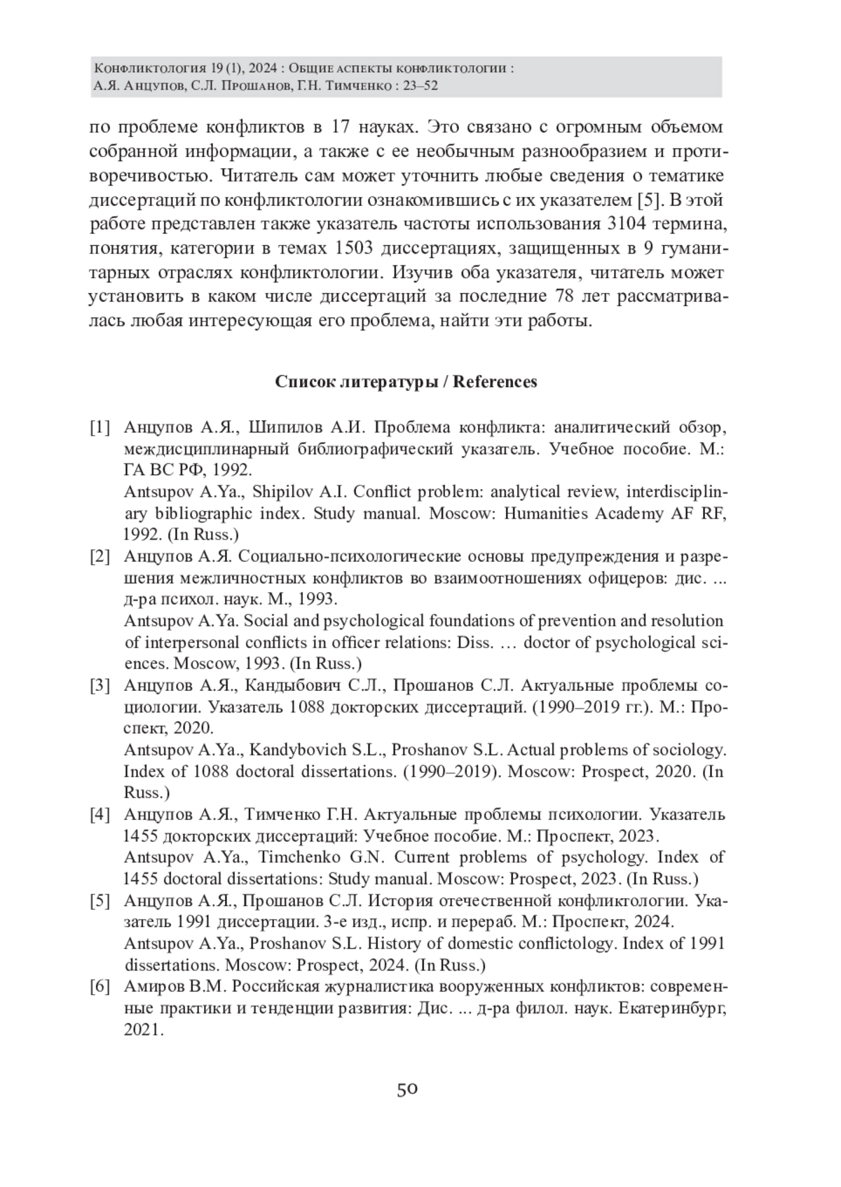 ТИМЧЕНКО Г. Н., ПРОШАНОВ С. Л., АНЦУПОВ А. Я. КОЛИЧЕСТВЕННЫЙ АНАЛИЗ 2134 ДИССЕРТАЦИЙ ПО ПРОБЛЕМЕ КОНФЛИКТОВ // КОНФЛИКТОЛОГИЯ. 2024. Т. 19 № 1