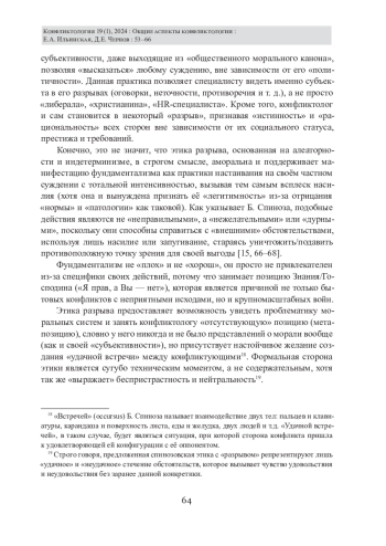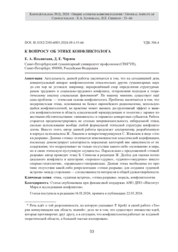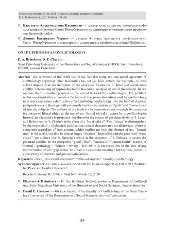 Актуальность данной работы заключается в том, что на сегодняшний день концептуальный аппарат конфликтологии относительно других гуманитарных наук до сих пор не устоялся: например, неразрешённый спор определения структурных рамок трудового и социально-трудового конфликта, гетерономия подходов к теоретическому анализу социальных феноменов[1]. По нашему мнению, существует ещё одна проблема - этическая основа конфликтолога. Проблема заключается в том, что модернистская этика, основанная на базисе европейского рационализма, использующейся конфликтологией, на практике может вызвать деструктивный эффект и вывести конфликтологию в область классической юриспруденции и теологии с заранее известными обстоятельствами: «виновность» и «правота» конкретных субъектов. Работа старается продемонстрировать не столько непривлекательность либеральной этики, сколько использование вообще любой формальной этической структуры конфликтологом. Вместо этого, автор данной работы предлагает альтернативу, разработанную в корпусе психоанализа Ж. Лаканом и конкретизирующуюся С. Жижеком в виде «этики разрыва». Данная «этика» отличается невозможностью классической кодификации, поскольку демонстрирует алеаторность моральных категорий вне зависимости от их содержания, что подразумевает не только отсутствие какого-либо «основания» в мире, но и свою этическую пустующую «сущность». Параллельно с предложенной «этикой разрыва» автор приводит этику Б. Спинозы в рецепции Ж. Делёза для оценки потенциального конфликта в категориях «хорошо»/«дурно», «удачно»/«неудачно» вместо «норма»/«патология», «правильно»/«неправильно. Данная этика необходима по причине отсутствия какой-либо репрезентации «этики разрыва» для создания «удачной встречи» между сторонами - согласованности интересов и общей удовлетворённости.